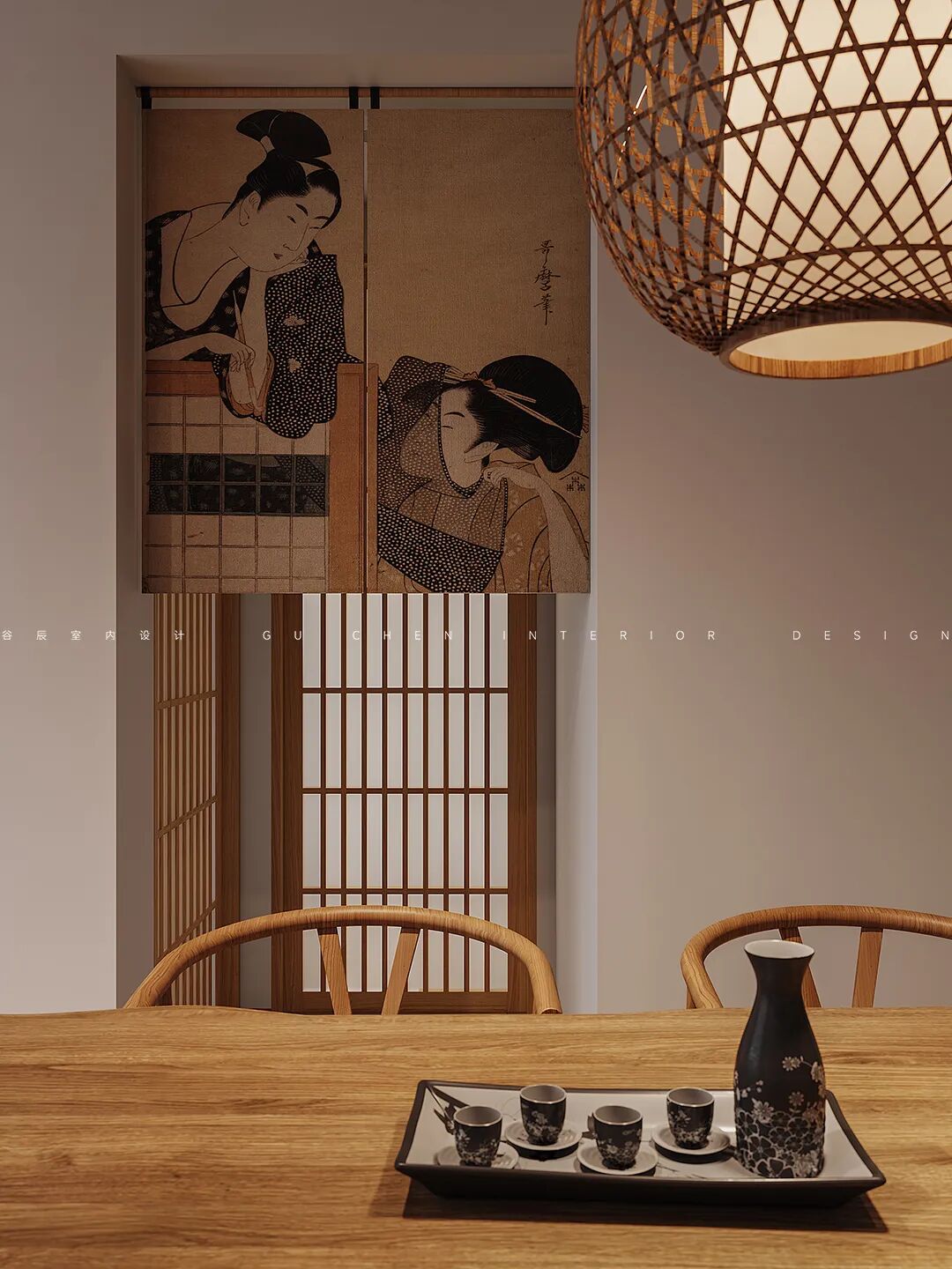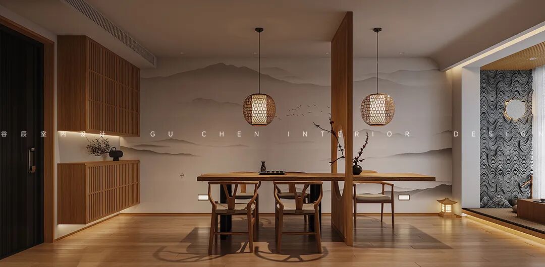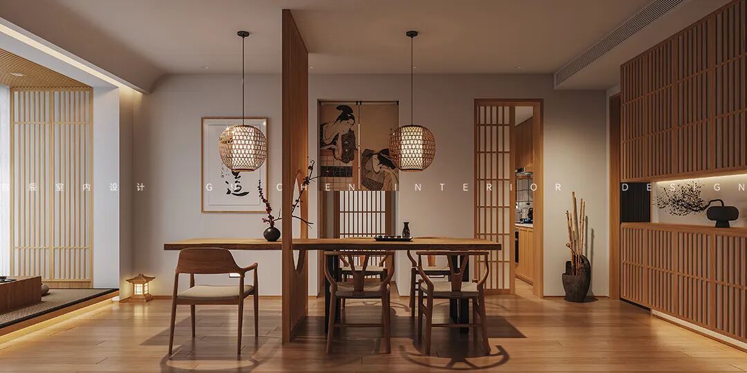 朴素简洁的长条形餐桌落落大方,餐厅上方的藤编式竹灯透出万家灯火,在日式少女的门帘映衬下,家与艺术绝美融合。