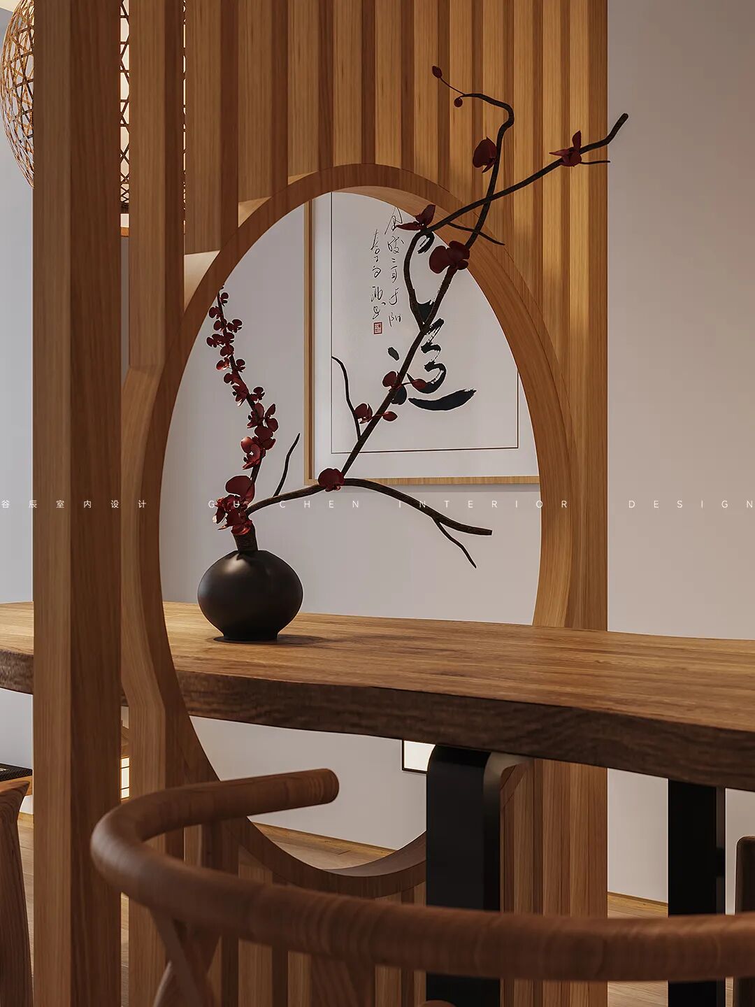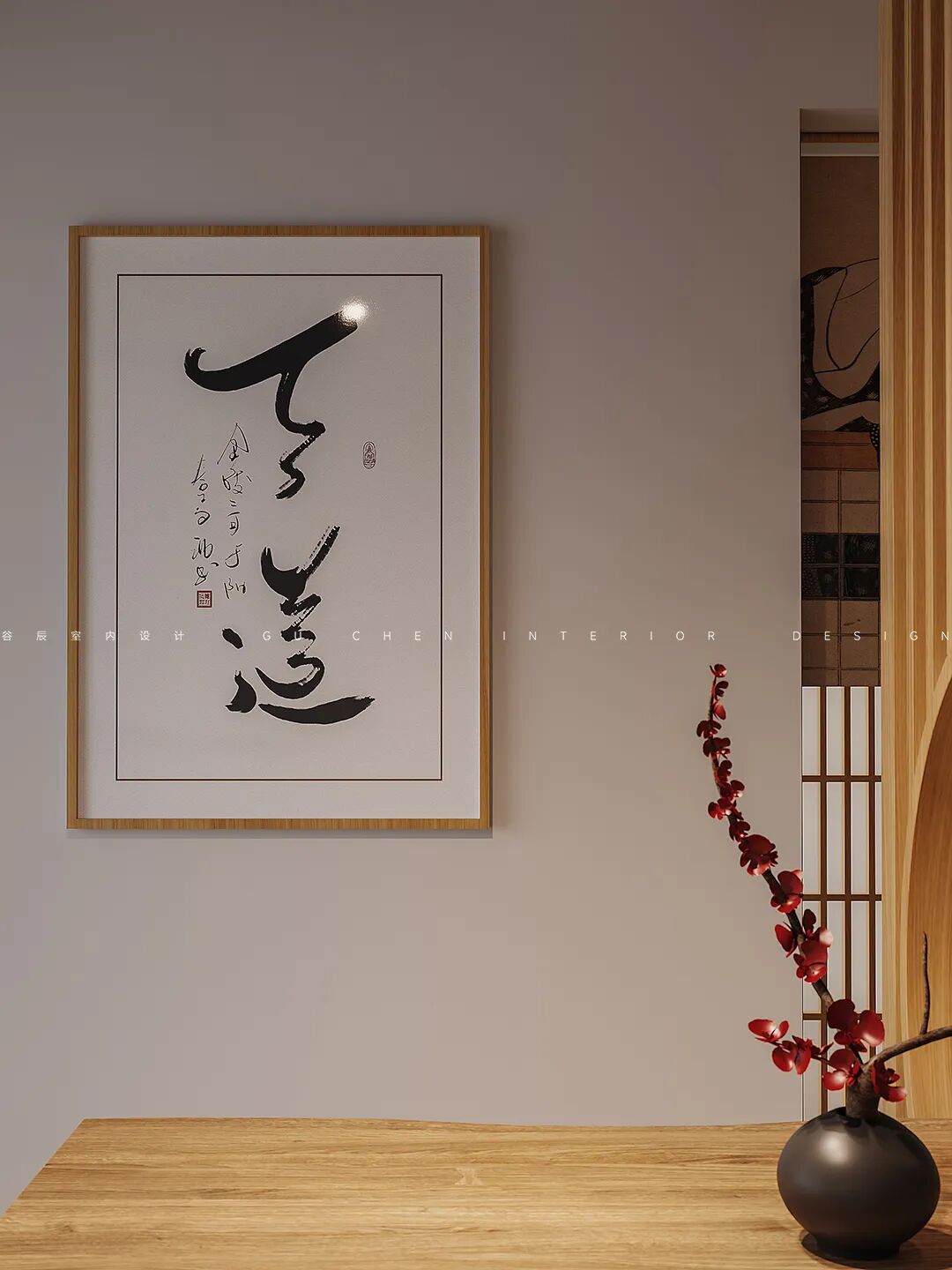 随处可见的小摆件则是屋主品味的展示。墙上悬挂的不是普通的油画而是带有禅意的书法大作,屏风处用红梅的摆件增添色彩,愉悦的心情飞扬在全家。