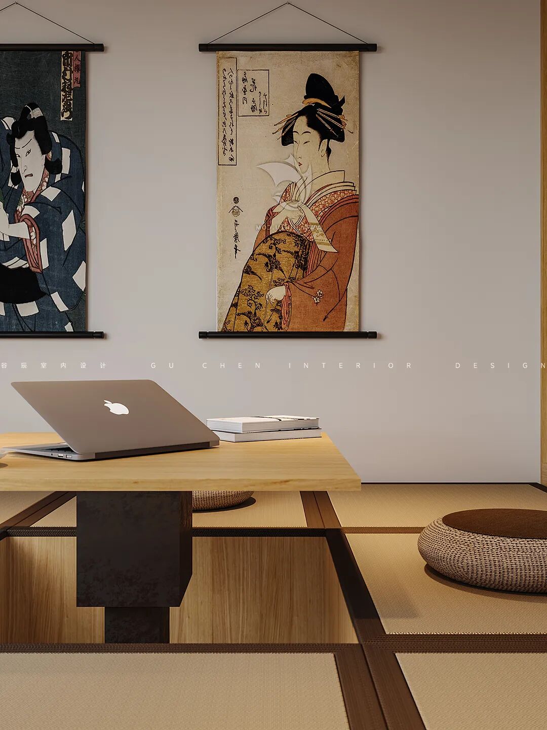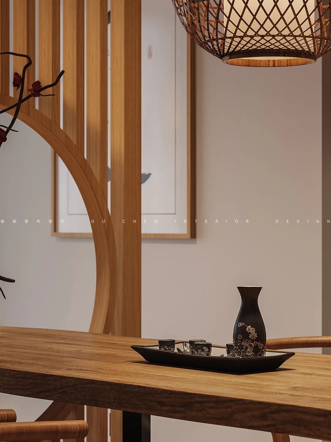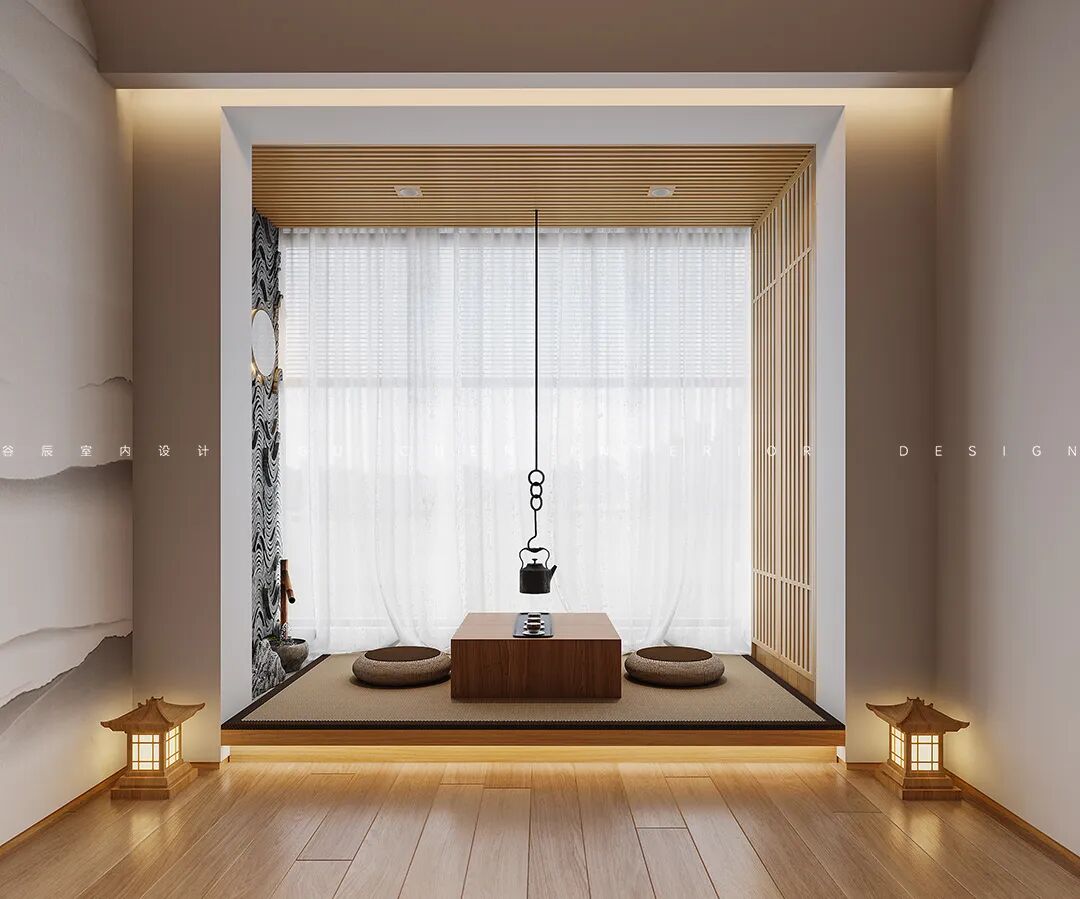 阳光从落地窗透过白色的纱帘洒在榻榻米上的蒲团,生活惬意休闲。简约大气的茶几上悬挂着黝黑的茶壶,无论是待客还是自酌,都悠然自得。