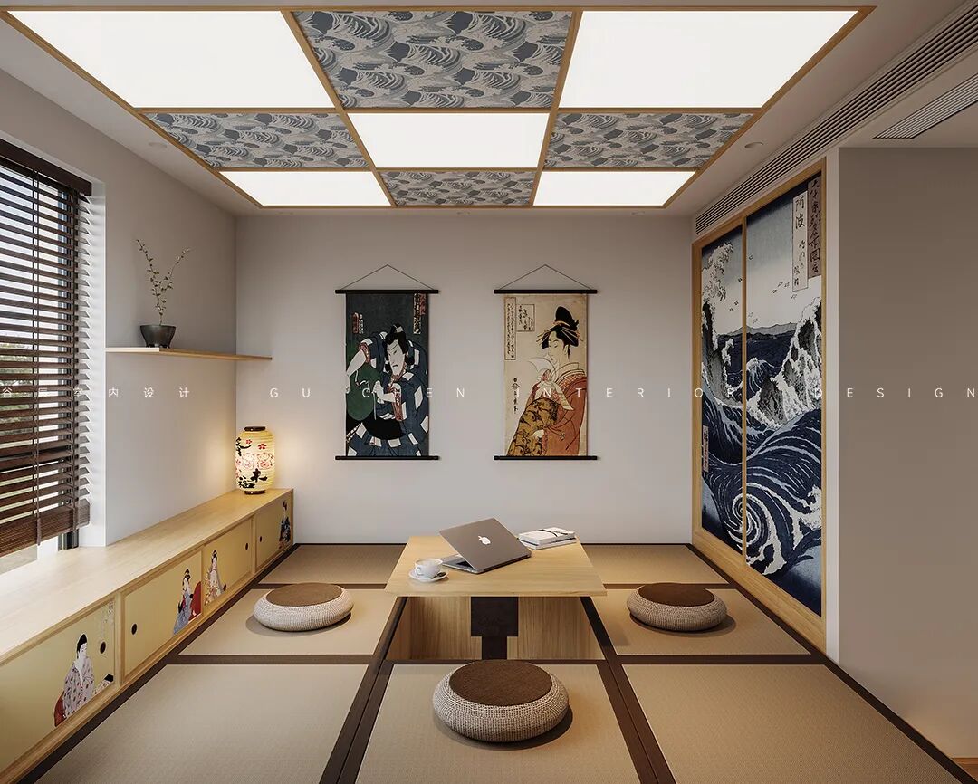 由于居住需求较少,主卧采用榻榻米的装修设计,中间升起的小桌满足众人的欢聚,也适合工作时的独处。顶部相呼应的波浪纹吊顶让日式风格绝佳展现。
