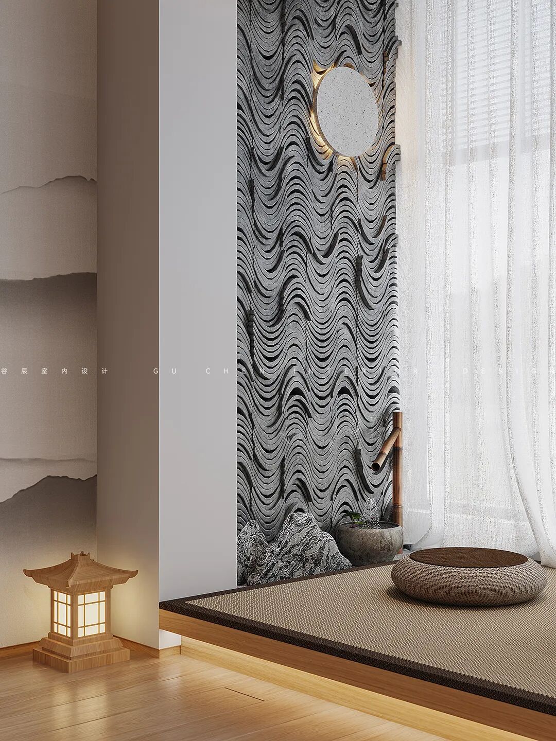 另一面则用凹凸起伏的砖瓦打造整面背景墙,增添空间的立体感,墙角的山石、喷泉水缸和竹筒龙头都带来的禅意与自然的诗意。