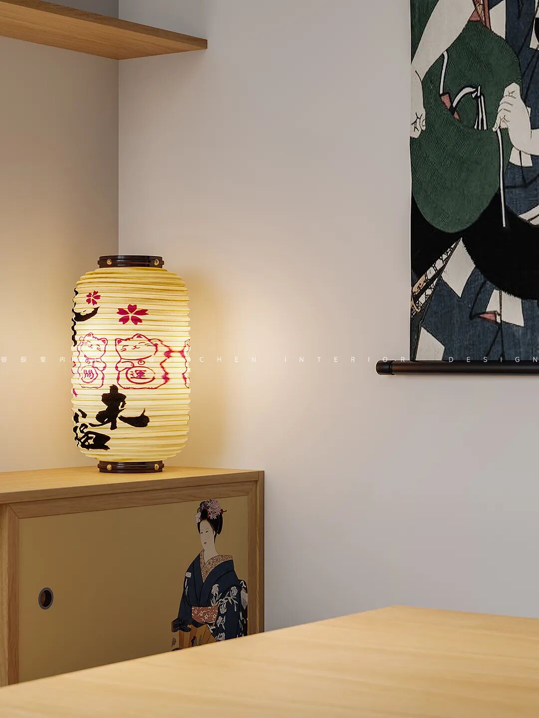 简约不是简单,柜门上的仕女图案、桌子上带有梅花与吉祥猫的灯笼,墙面上艺术独特的绘画,仿佛带着屋主来到了冲绳,享受来自日本的假日风情。
