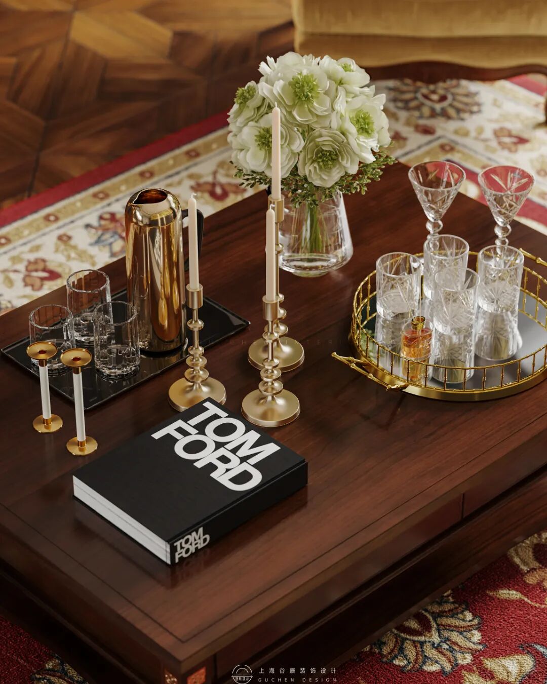 茶几同样是中式经典的红木,正因为中式审美强大的包容性,让打眼的烛台和玻璃器具,被衬托的越发精美怡人,一束白色花束,是整间屋子为数不多的活泼主力,与旁边的**熏香一起,散发出迷人的馨香。