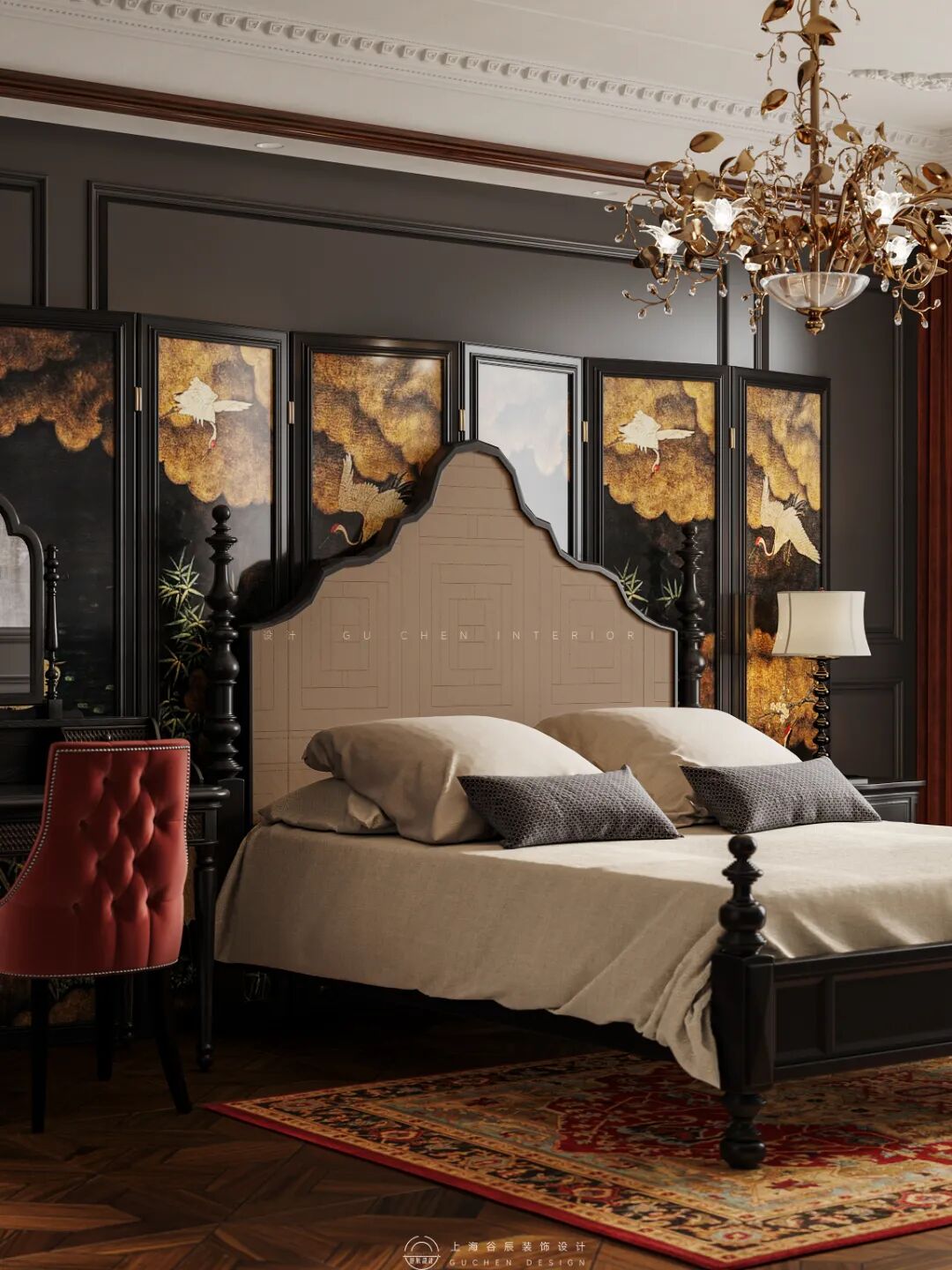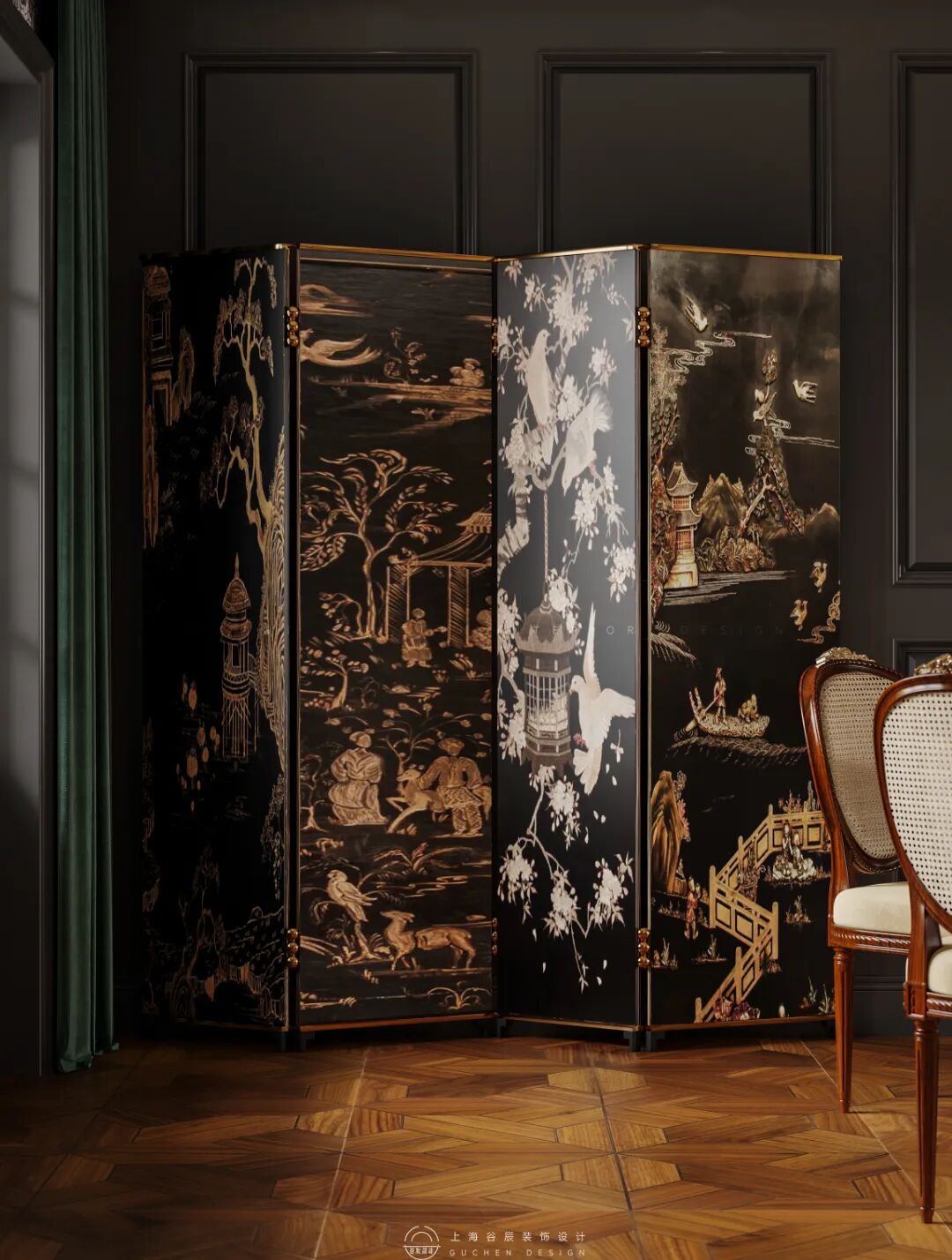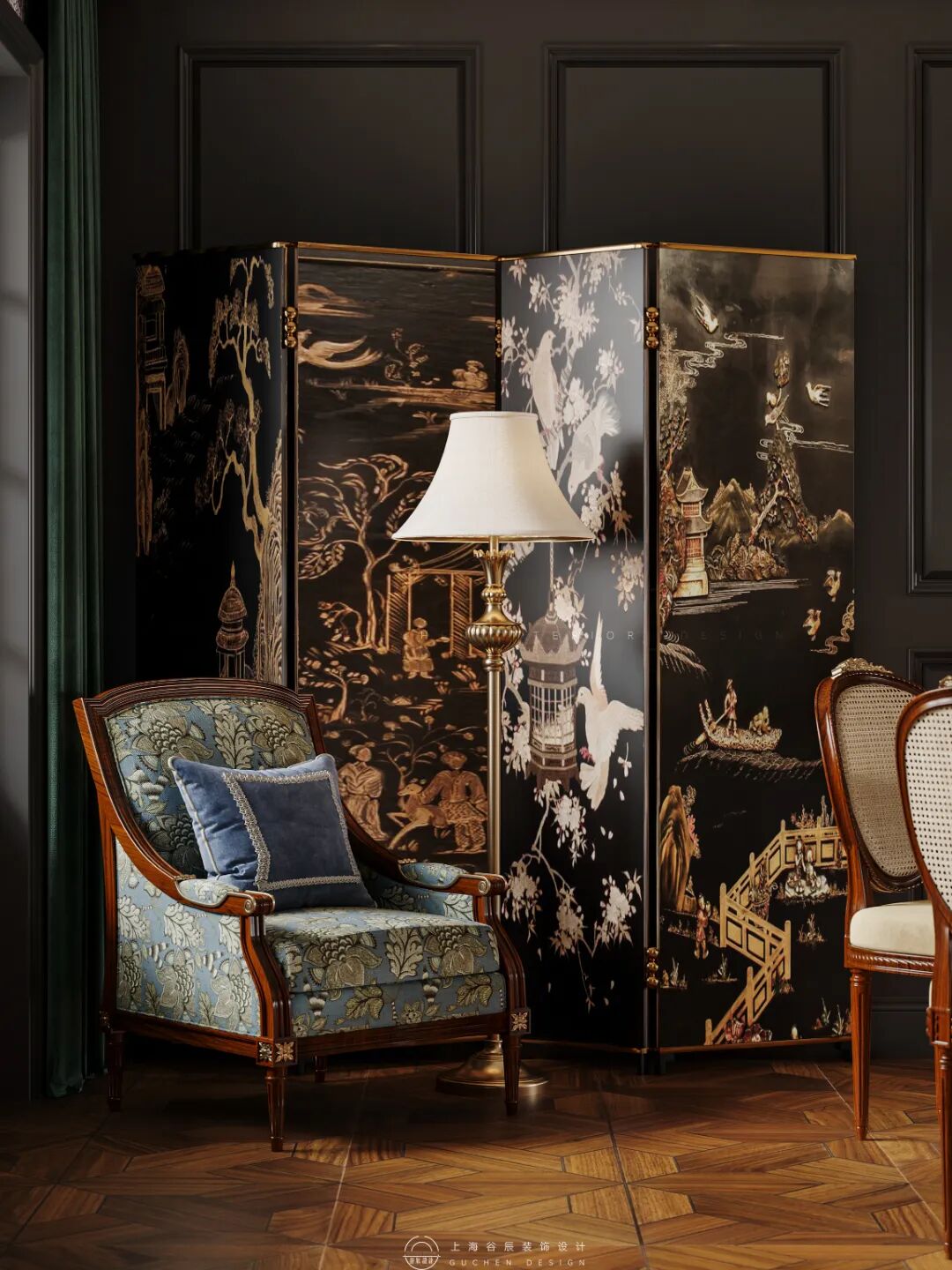 在软装的风格上,大胆的使用了中式具有深意的仙鹤图作为屏风图案,同时,华丽的金属吊灯,在这中西合璧的屋内,又多了复古工艺元素。
