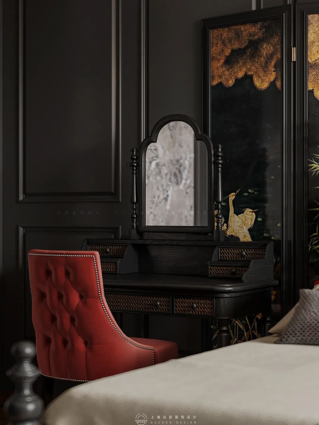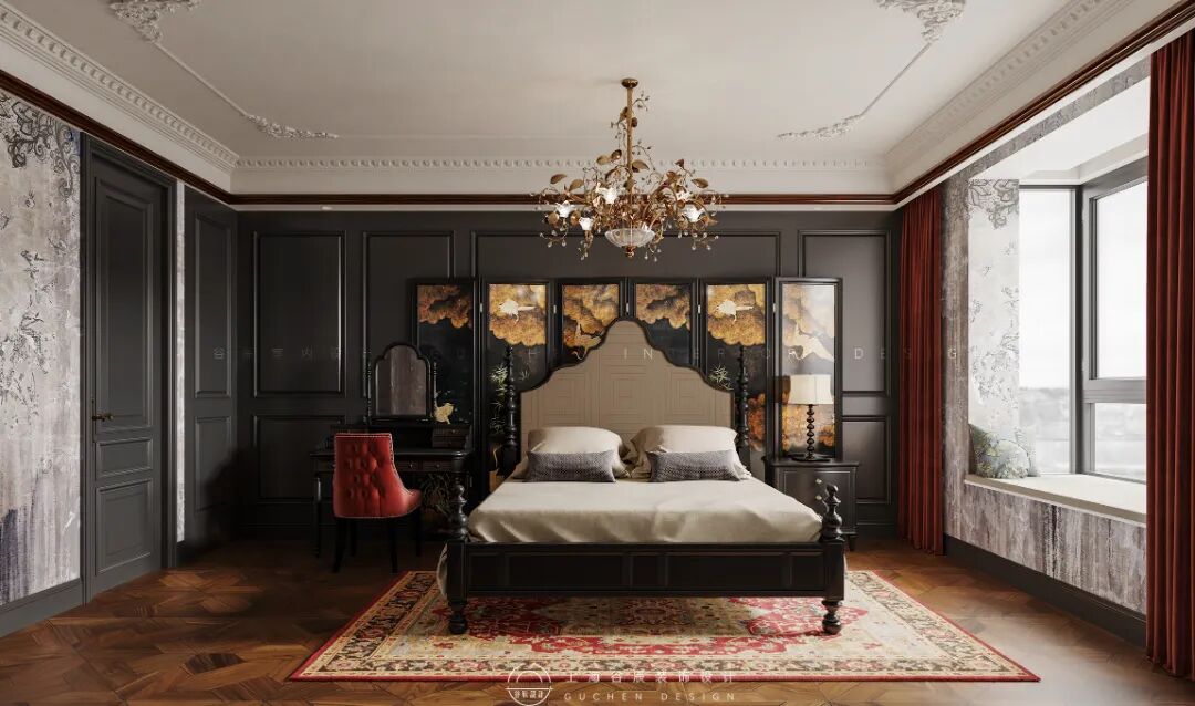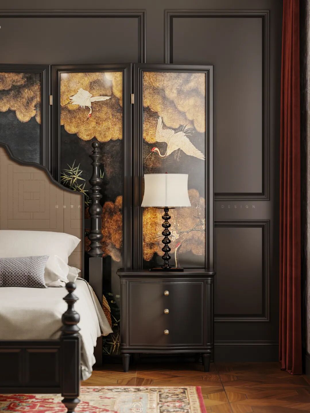 在软装的风格上,大胆的使用了中式具有深意的仙鹤图作为屏风图案,同时,华丽的金属吊灯,在这中西合璧的屋内,又多了复古工艺元素。