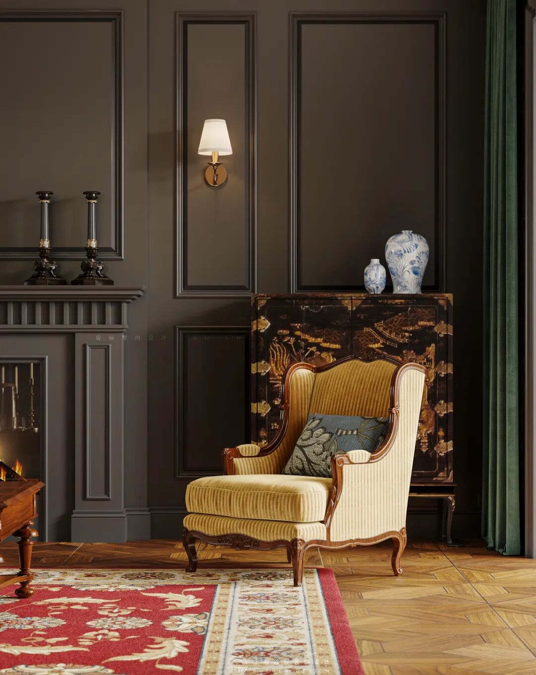 本屋设计的特点在于,细节处皆体现出主人身份的矜贵,在精美花纹的橱柜上,是中国经典的青花瓷,屋主的生活情调在此处一览无余,倚靠在柔软的弧形靠背椅上,听着壁炉中柴火的呲啦声,火苗跳动着,温暖了人心。