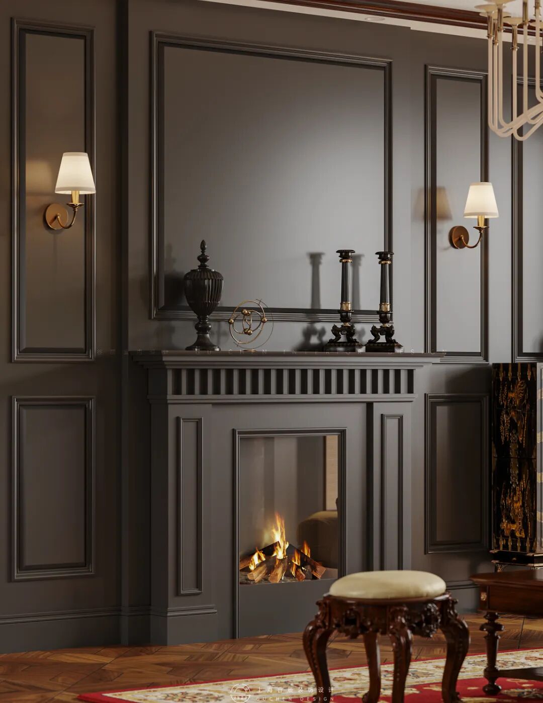 在色彩上选择房屋墙面主题色调深巧克力棕作为壁炉背景墙的颜色,外观上仅仅采用简约的立体石膏线作为雕饰,同时在装饰上白色优雅的壁灯与经典的黑色烛台作为点缀,玄关处色彩浓烈奔放的抽象画,彰显出屋主不凡的艺术品味。