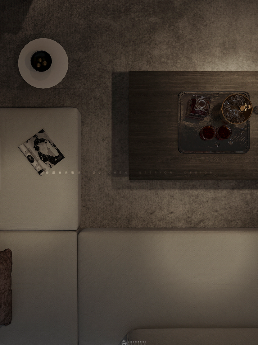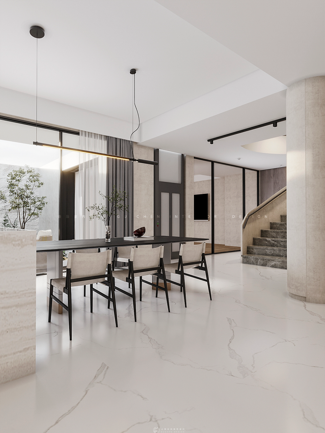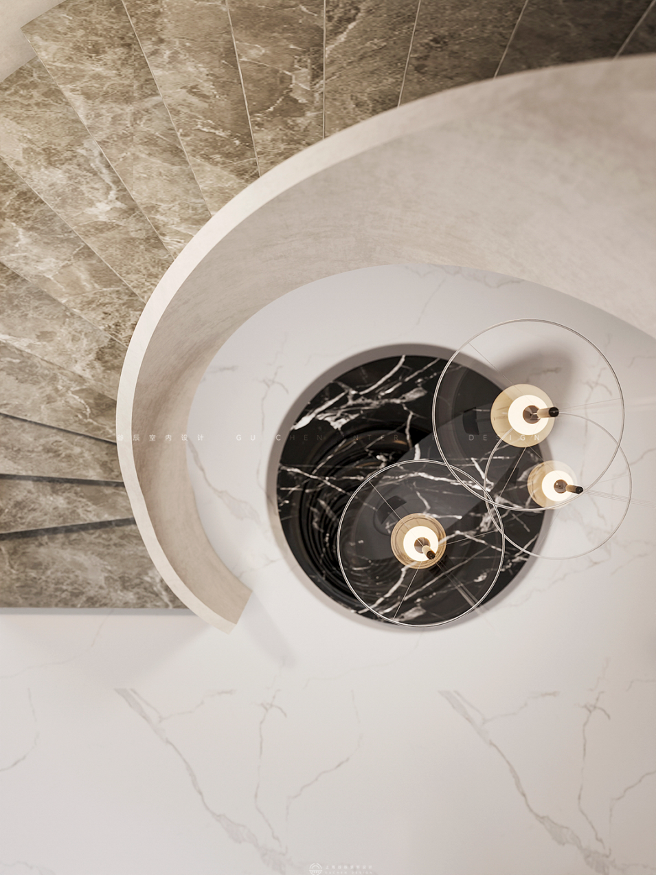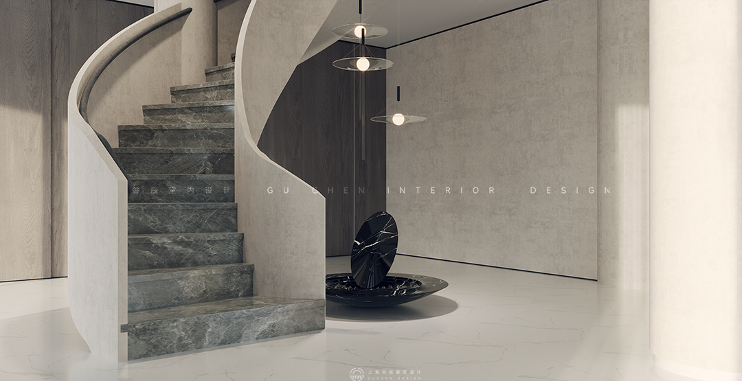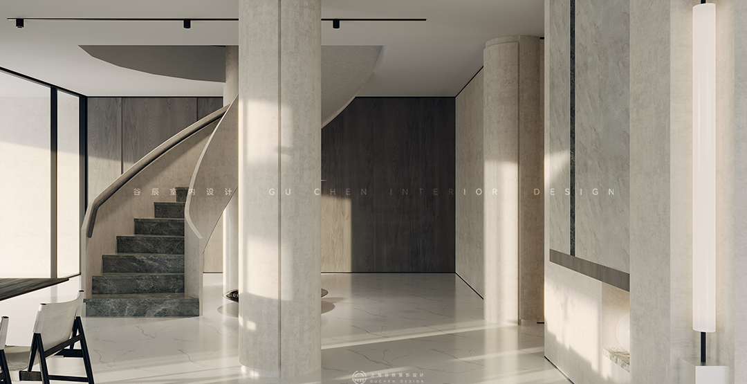 GU CHEN The story behind it 诧寂美学,一种残缺自然之美,运用在本套住宅中,用材上常使用原木、亚麻、素水泥等原质感材料,整体以灰白色、原木色等大地色系为主,家具等陈列上有着时间洗涤的痕迹,让空间极简安静,朴素自然的美感。 侘寂美学,是遵从内心的表达,再现真实的状态 不完美的物品和肌理,表达脱俗、质朴的心境 在日常的室内设计中,业主对侘寂风格的接受程度可能没有那么高,但是又非常向往质朴禅意的格调,可以在原本的侘寂风格中进行简化。将极简风格与侘寂元素相融合,创造出一种更为简约质朴的氛围。不同于其他风格轻奢、时尚、现代的特点,侘寂风的美,是返璞归真,在破旧的物件中,感受岁月本身的美感。 01楼梯 「极简风时尚、素色楼梯踏步砖」