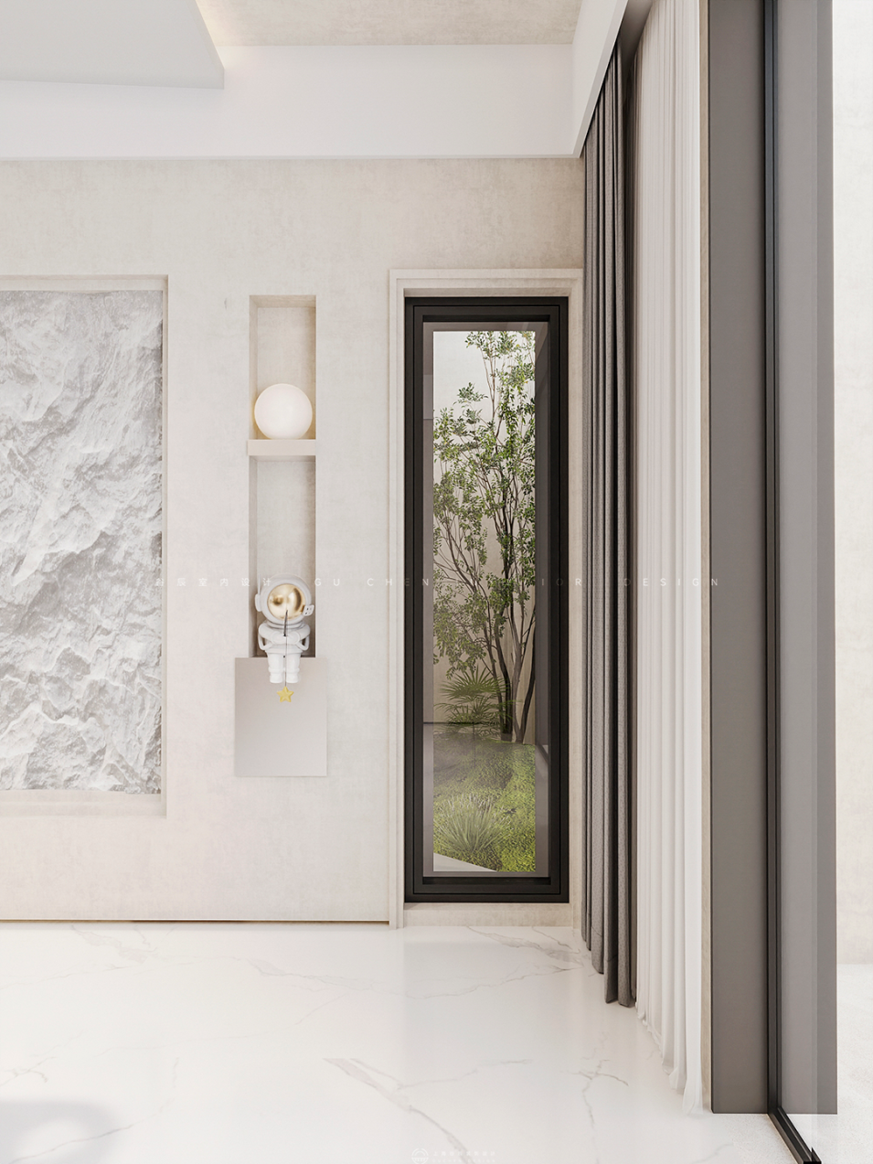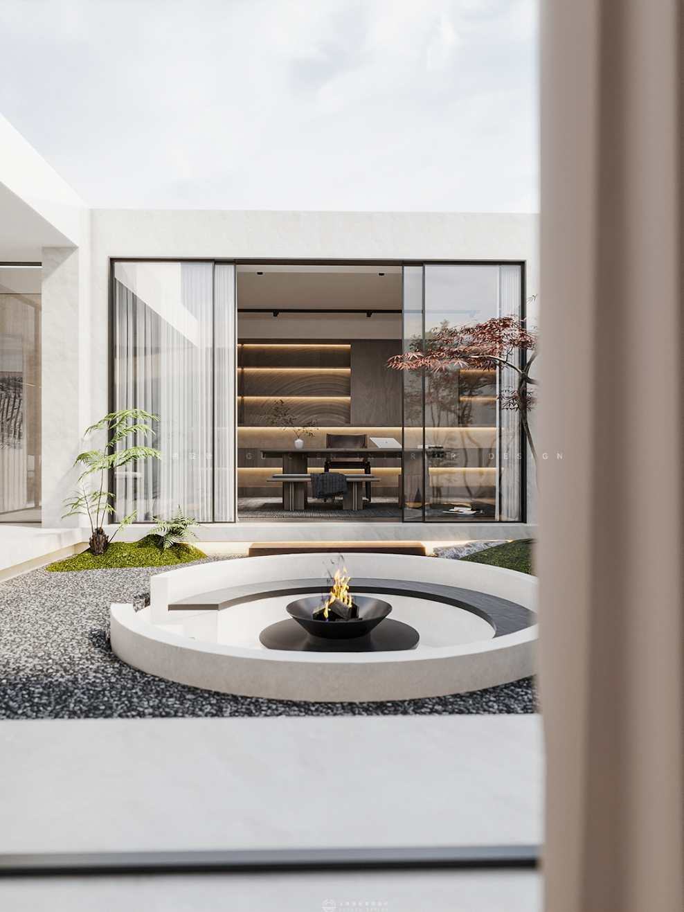 正面采用全透明玻璃推拉门,保证庭院景观一览无余,弱化结构墙,以半围合的形式构建一种温柔治愈的氛围。