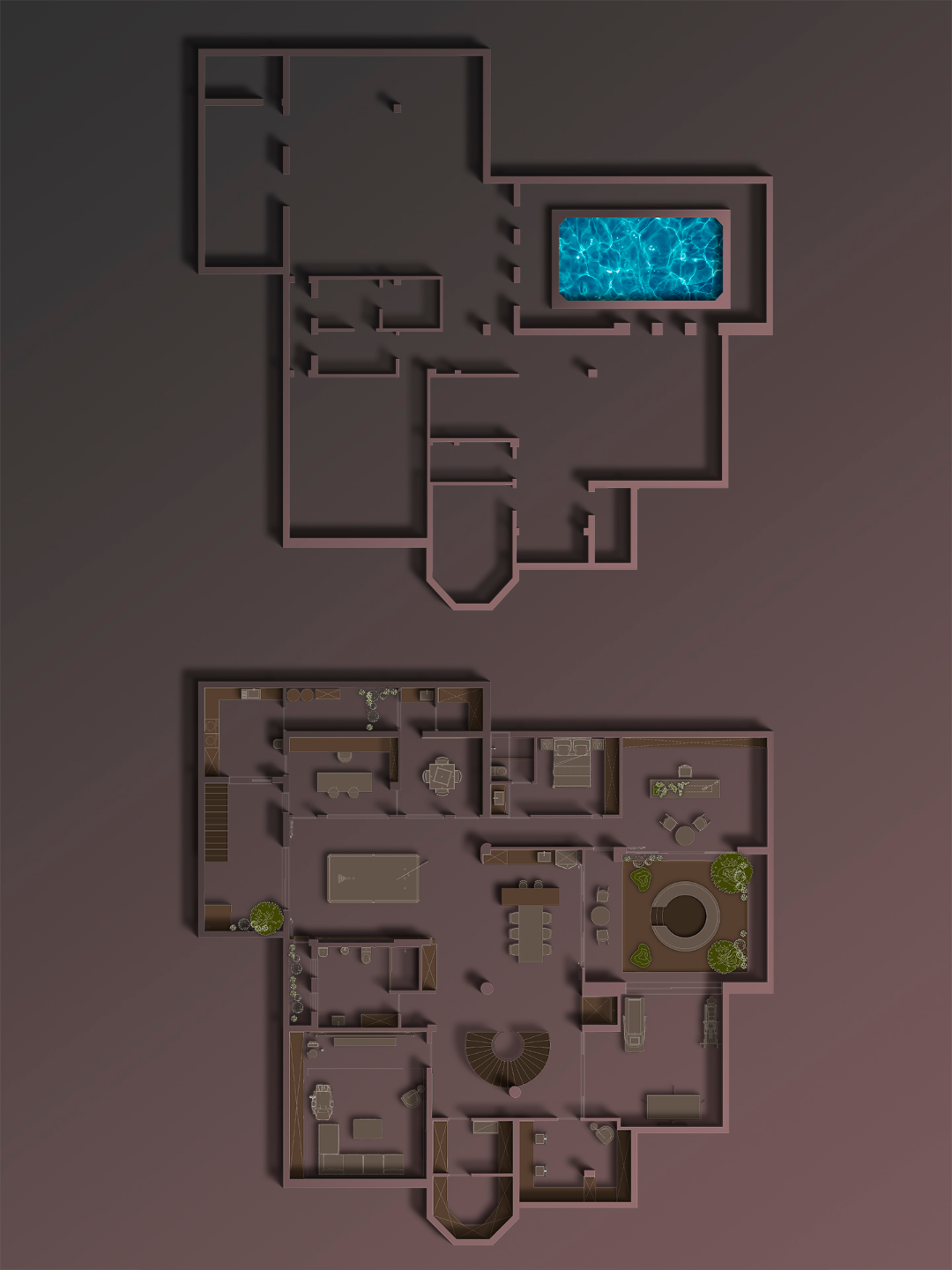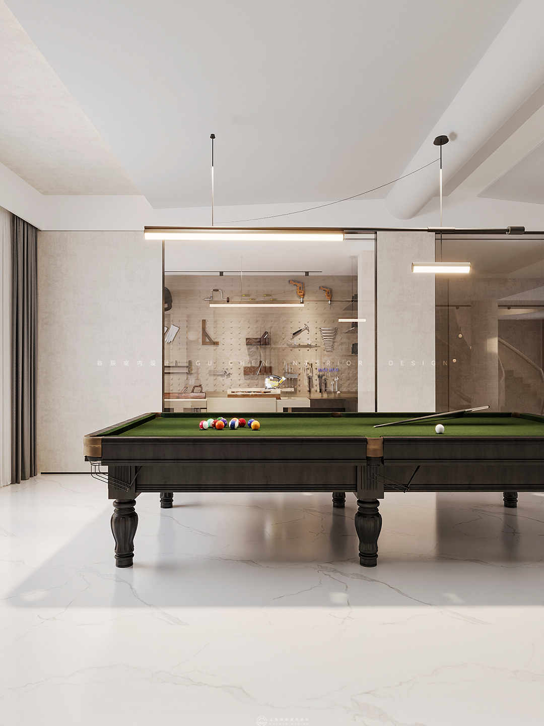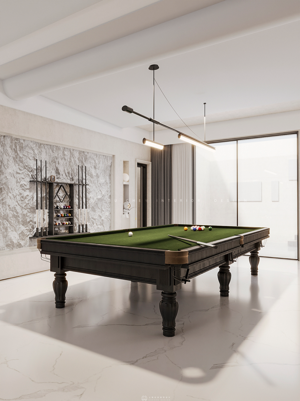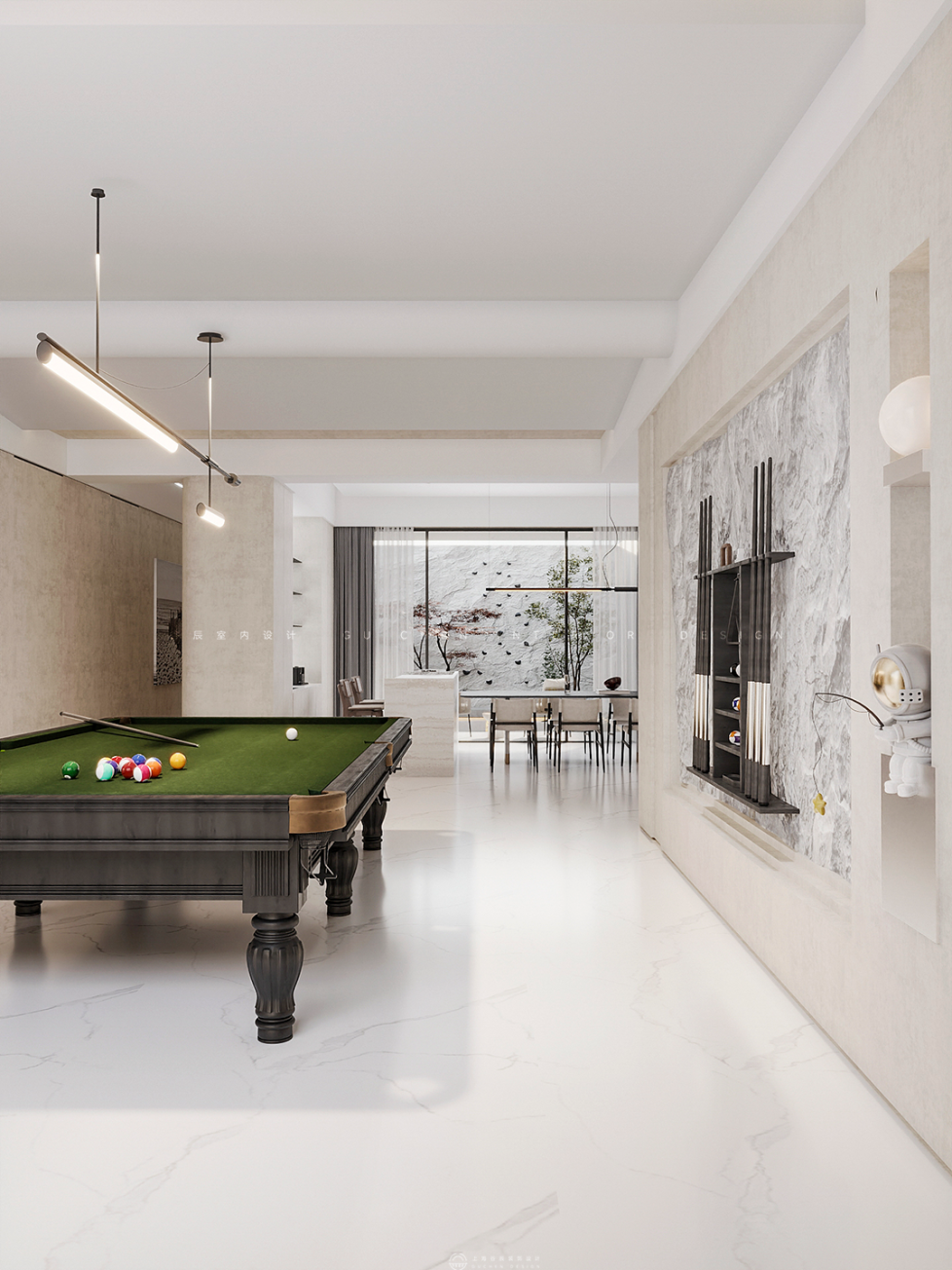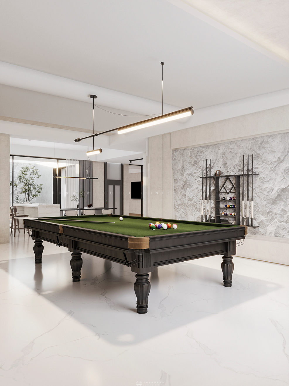 在客餐厅旁边,还设置了台球室,大理石纹的墙面整齐的摆放着台球器具,价格昂贵且配色高雅,台球桌上散落着些许彩色球,是屋主打过后便随手搁置的,静静等待着主人的下一次光临。
