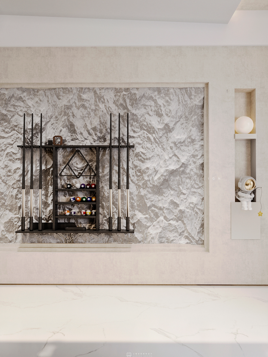 台球区域背景墙致敬了**建筑大师卡洛.斯卡帕,采用了叠级造型加灯带的方式,营造氛围,同时框定了一个长方形背景,加铺贴星月石凸显肌理感。