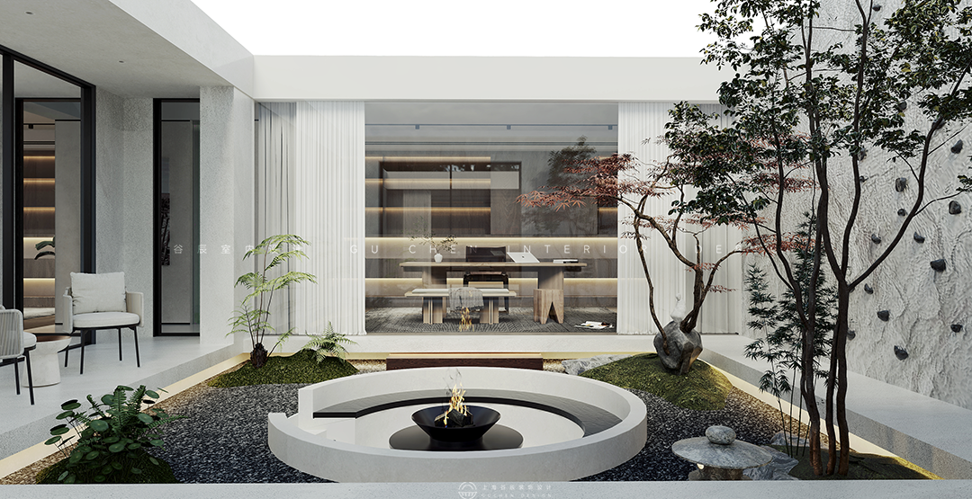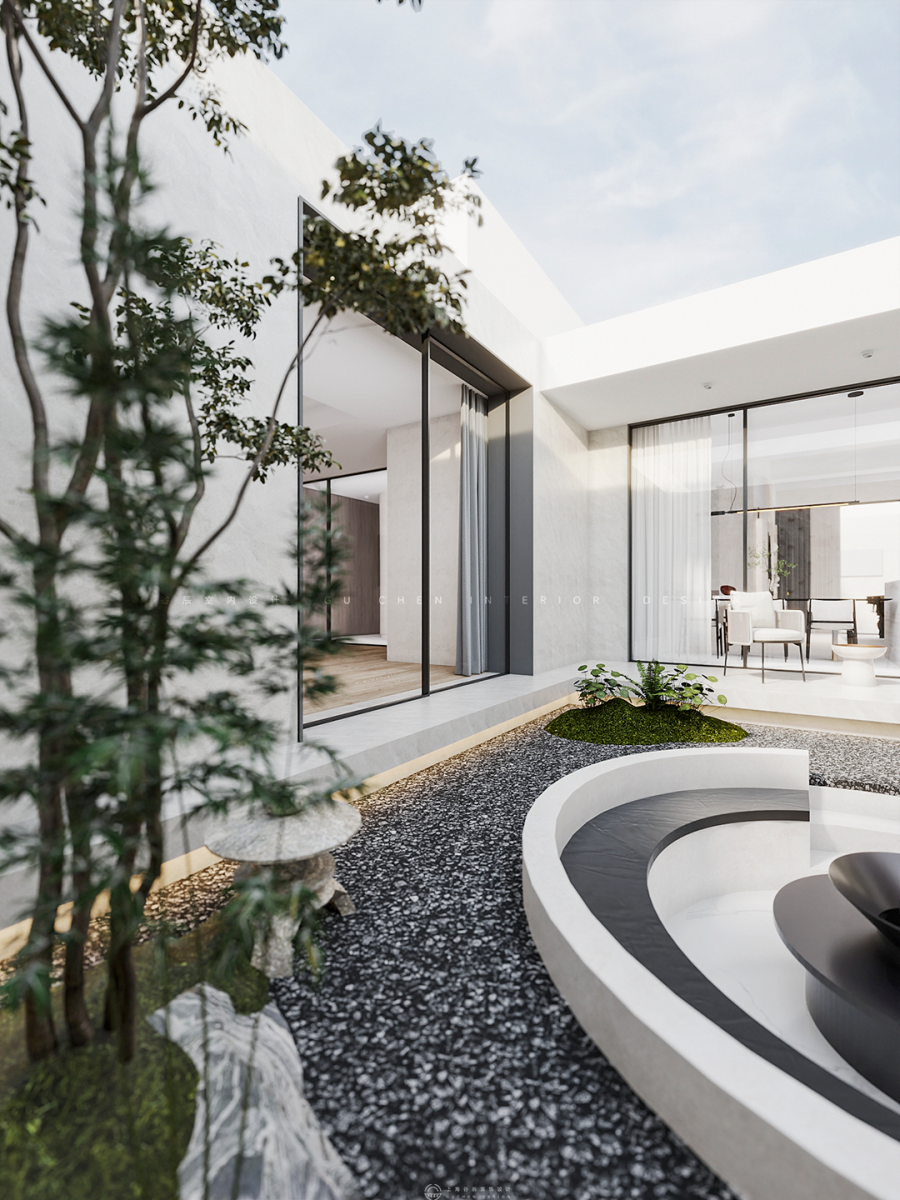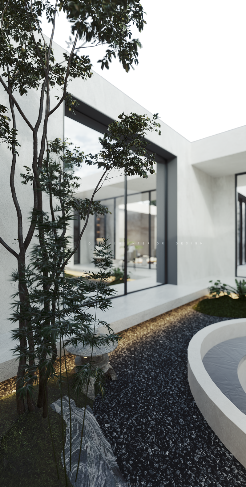 墙面的材质上大面积采用米白色毛面质感的石材,地面除了绿色景观外铺满黑色的小碎石与墙面层次分明对比强烈,整体感觉既现代又不失传统的东方园林禅意之美。