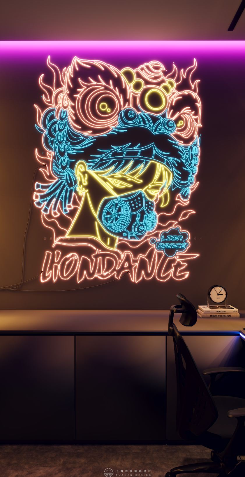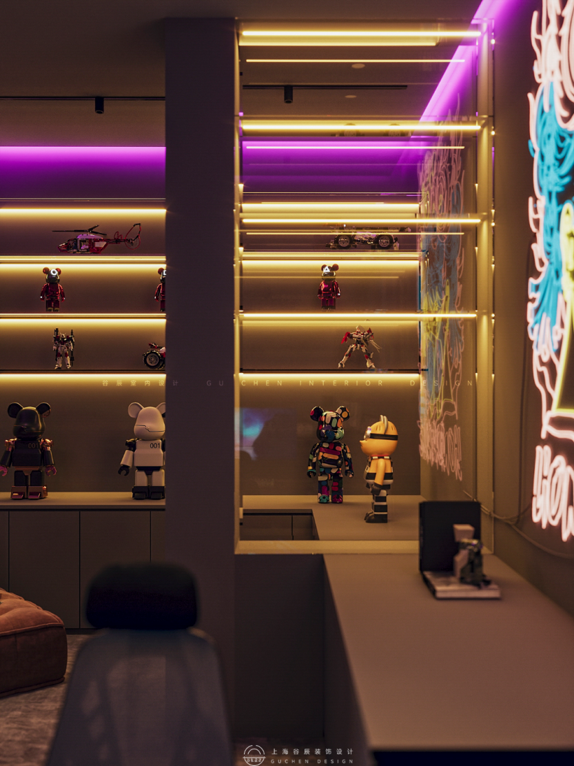 色彩鲜艳的灯带与墙面灯饰,给整个房间营造一种赛博朋克的未来感,侧面墙上摆放着整整齐齐的暴力熊是屋主的心爱之物。