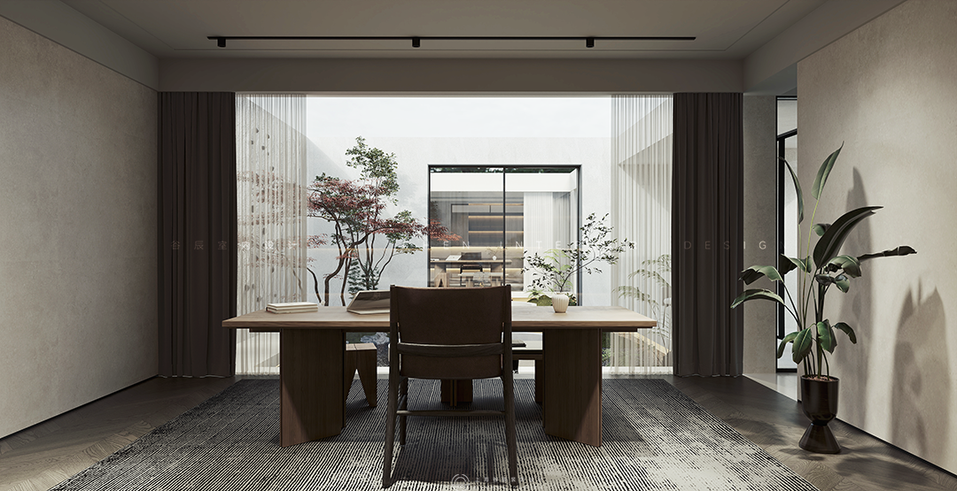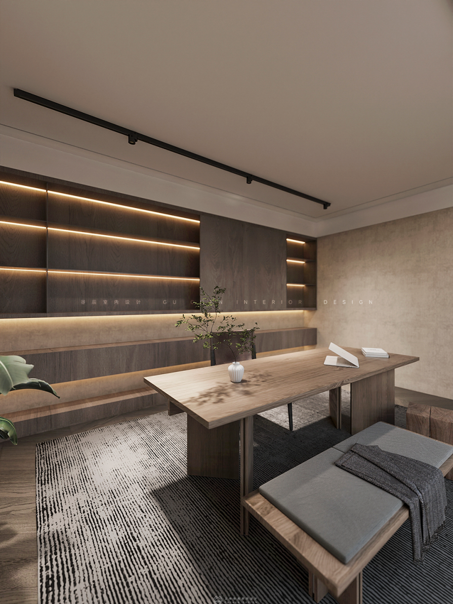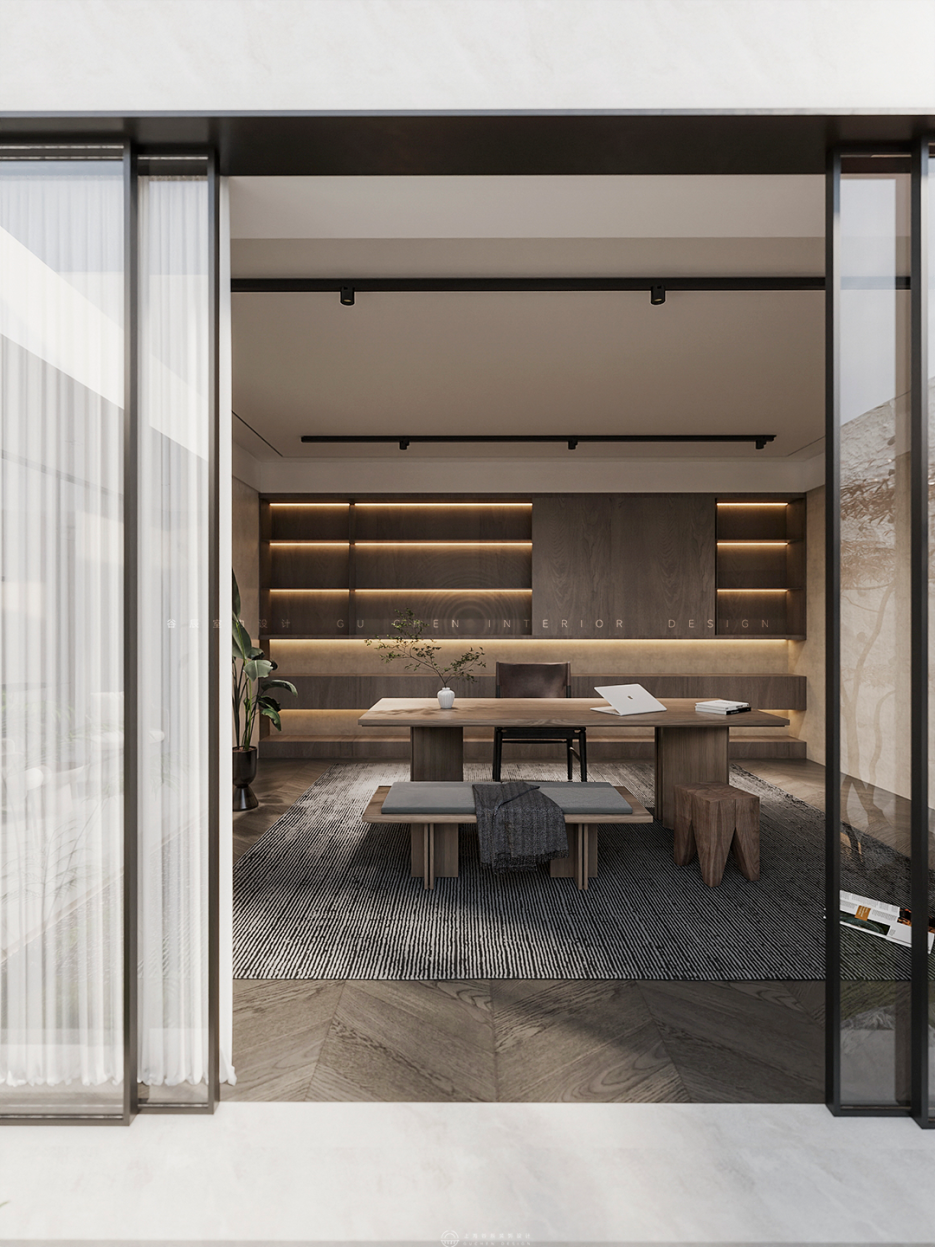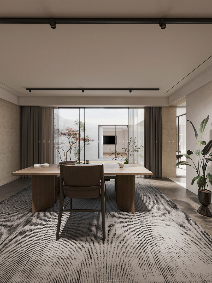 当不想再继续打球时,便可沿着设计师设计的开放式动线,辗转到茶室、家庭影院、电竞房等房间,以庭院为中心,尽显高级和简约。 04茶室 「自然魅力,东方极简的惊艳」