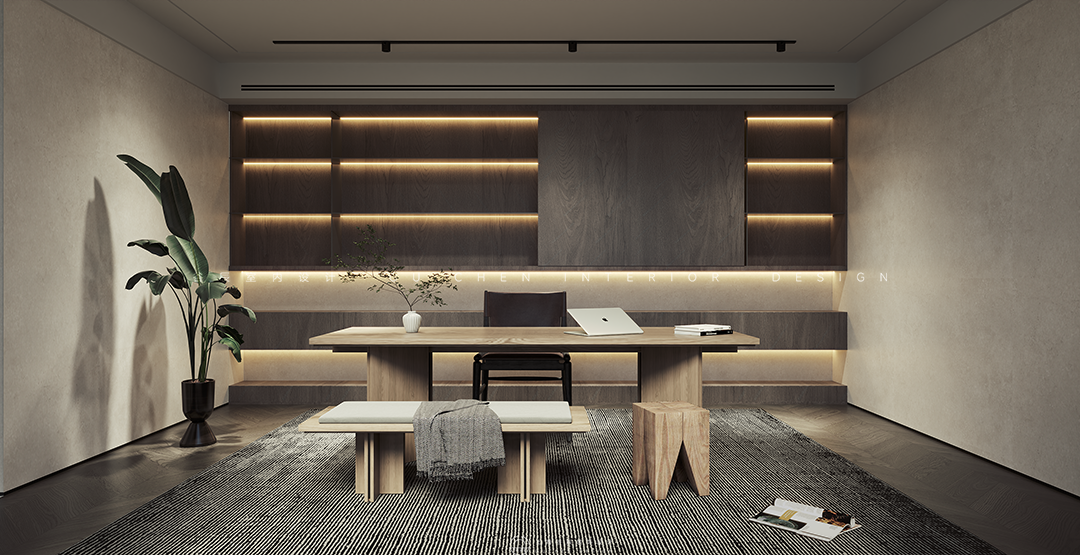 茶室整体颜色以原木色与黑色为主,背面墙只采用宽沿百叶窗,微采光更显屋内的静气,木质桌椅上闲散的摆放着书籍和盆栽,再一次体现了侘寂之美。