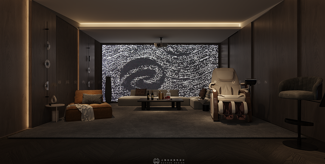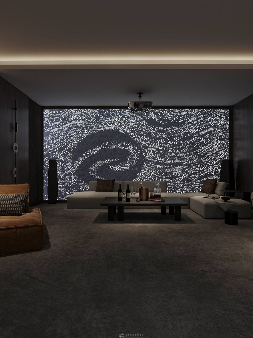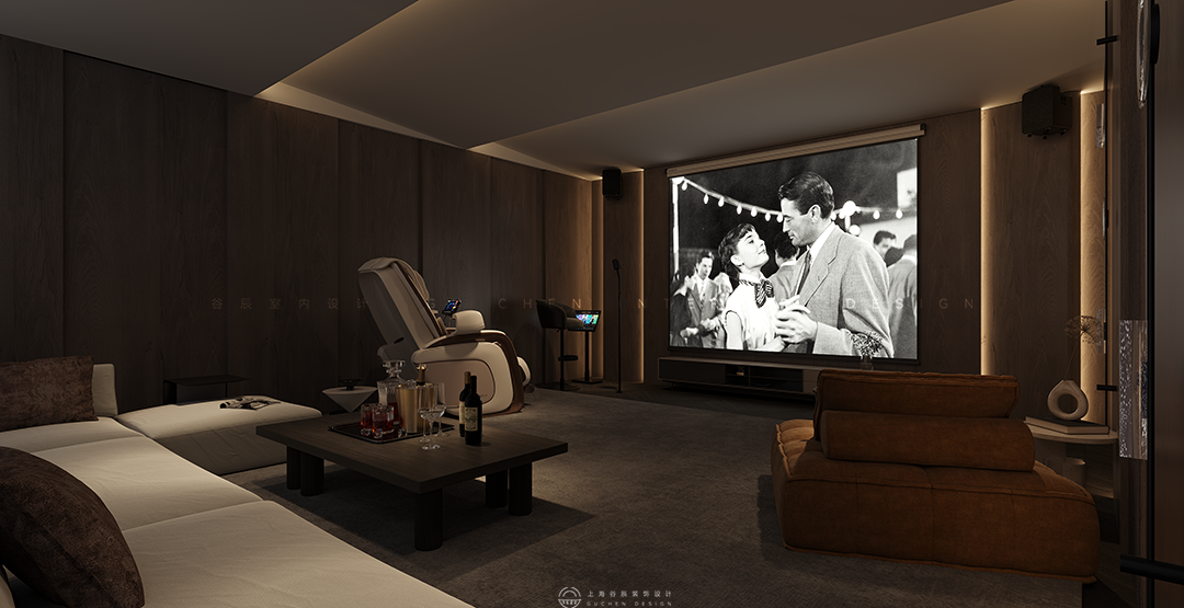 棕栗色与棕红色交织在这观影房内,硕大的投影幕布,高清画质,让观影的体验升级到**,L型长沙发足够众多好友齐聚,方形茶几上是酒水与零嘴,富有生活气息。