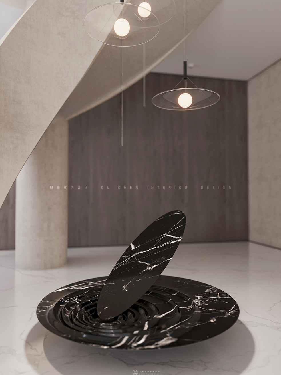 悬浮式艺术摆件与多层玻璃吊灯,既有美的感官体验,又做到了照明指路,是实用与美观的结合佳作。