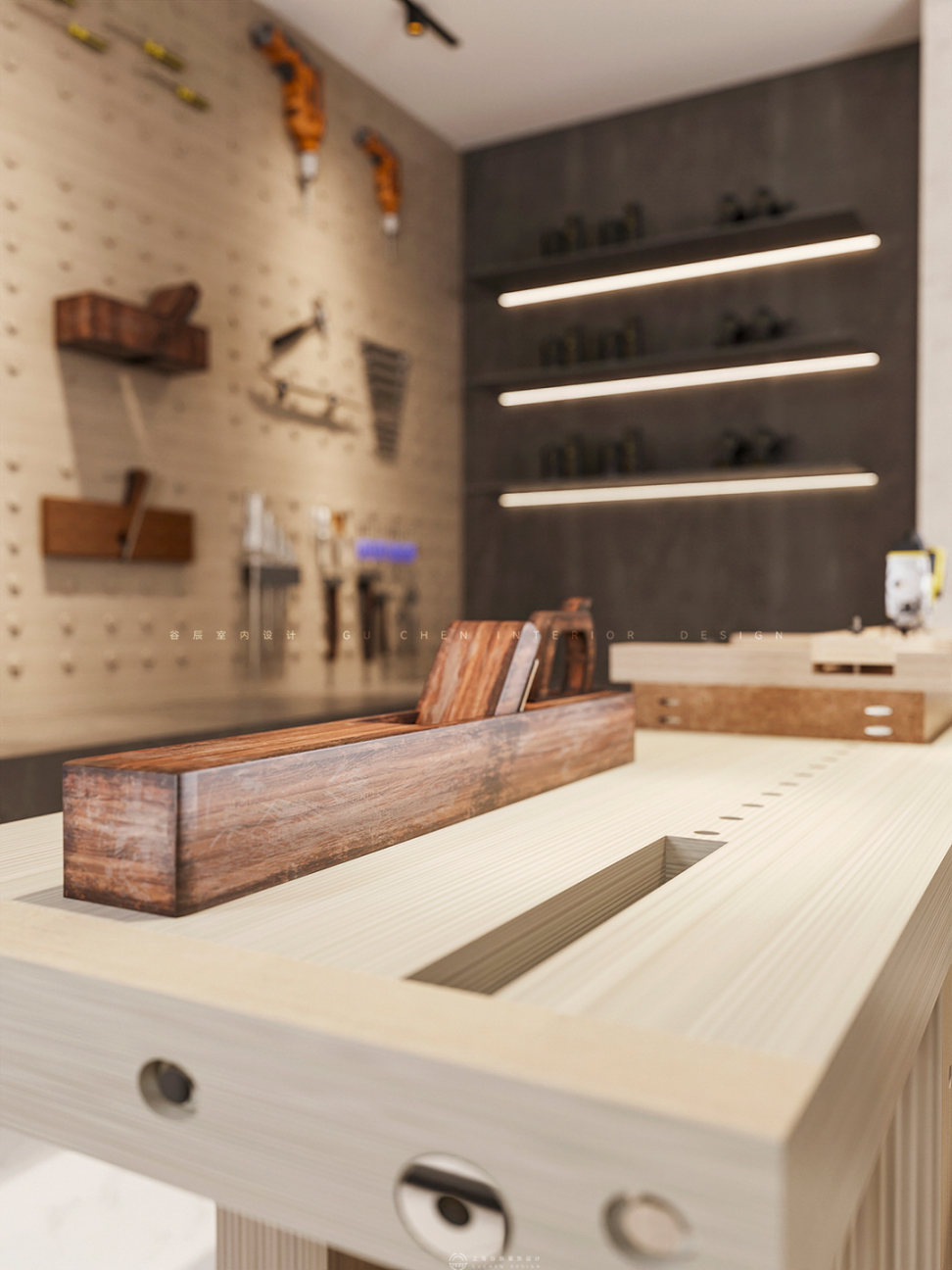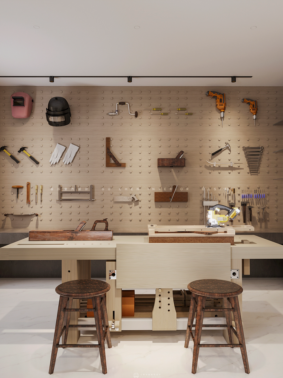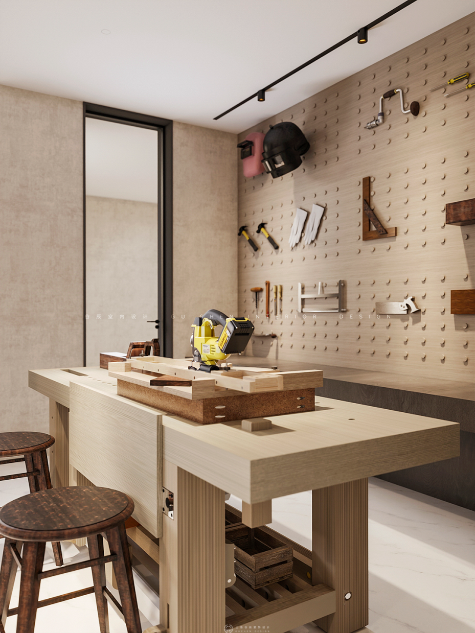手工房设置原木置物墙,用于摆放屋主的各式手工工具,整块原木色的超大型操作台,是手工爱好者的梦中情物,释放对创造最原始的热爱。
