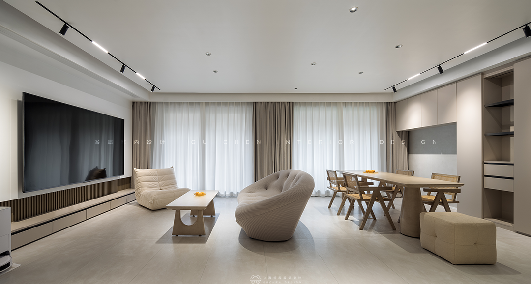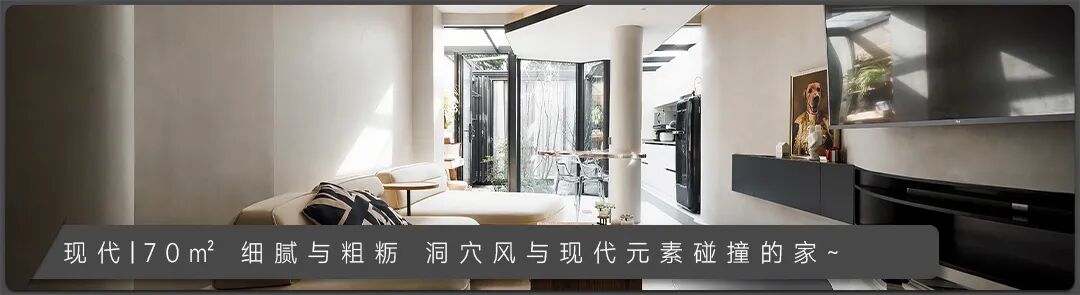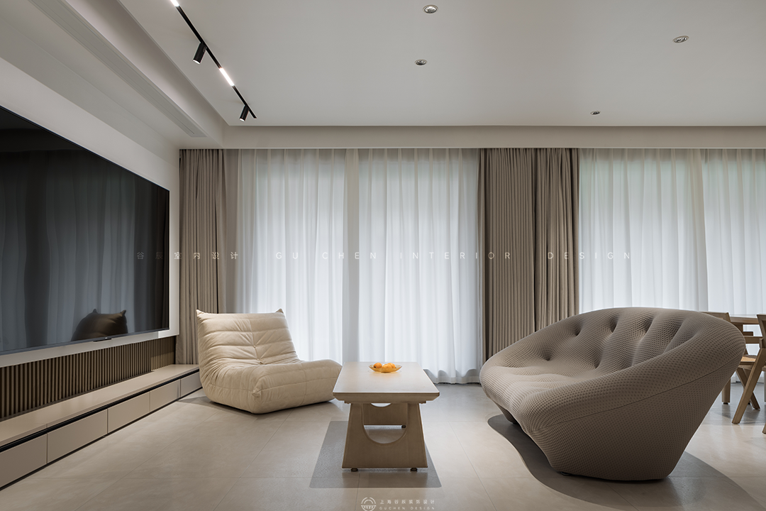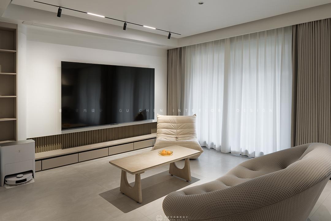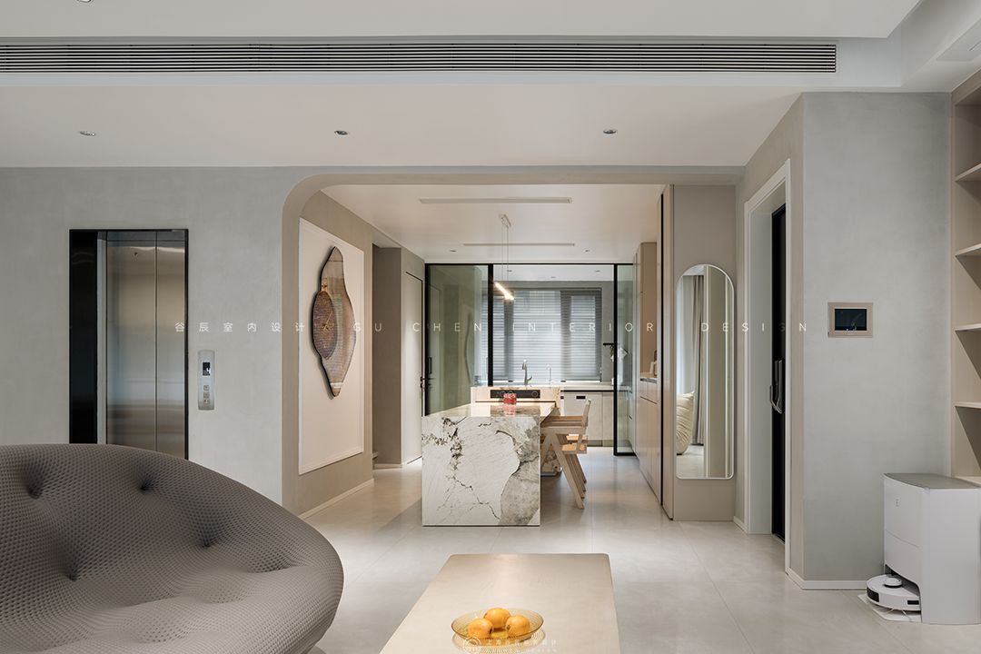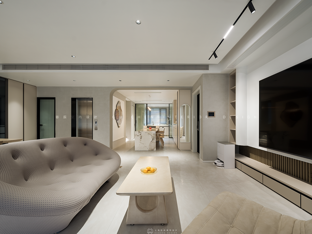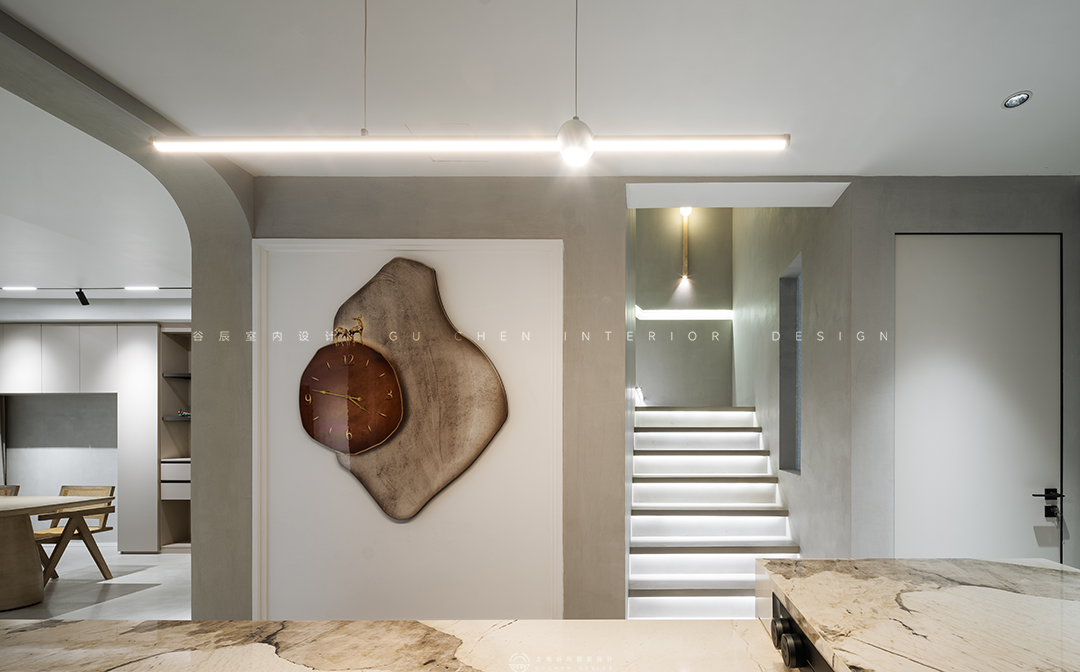 本期分享的屋主从事工程行业,一家三口其乐融融的生活着,居家的时候除了陪陪家人,就是处理工作和进修学习,因此拥有很多个人藏书,古有言“旧书不厌百回读,熟读精思子自知”,在行业中不断精益求精。本套主要用于居住的双层公寓将现代风与时兴的诧寂相结合,诧寂一词源于日语,是一种充满岁月感的美,是历经时光打磨依然温柔的美学本色,本套设计将诧寂之美引入生活,以温柔冲淡寂寥,营造了一个岁月之外,舒适而宁静的精神家园。 “寂”庄严而又优雅,万籁俱寂宁静美好。 诧是质朴,寂是时间的沉淀,诠释出空间朴素、安静、素雅的自然质感。 本案做了突破性大胆尝试,将侘寂与现代时尚柔美有机结合,整体采用现在主流的微水泥材质,木材的木纹理色和弧形造型,透着质朴侘寂之美,展现简约自然的气息,结合极简主义元素,重新演绎了当下流行的现代侘寂风。现代侘寂主张在平静的空间里窥见极简生活美学,将现代设计元素和质朴的材质融合在一起,是一种简单质朴却精致隐奢的美,更是一种生活态度。 01客厅 「简单与自然共融,平淡空间中营造高级感」