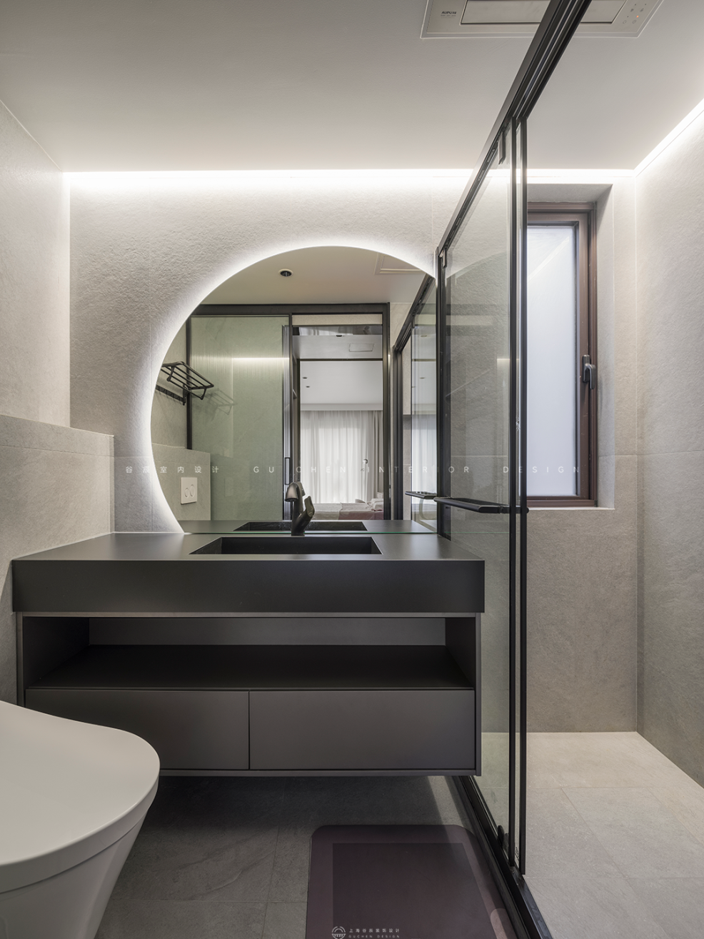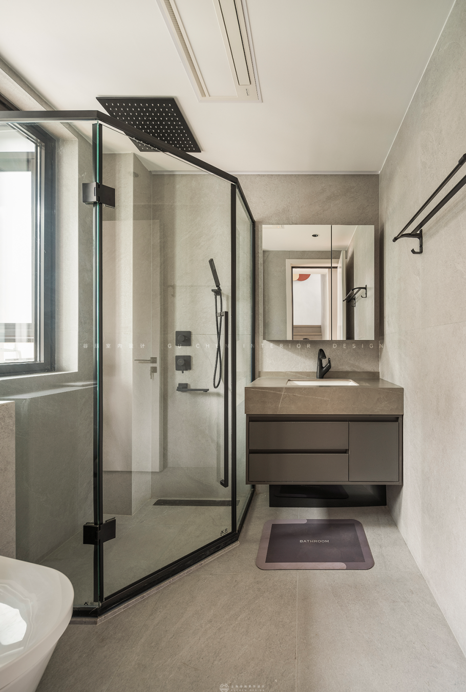 次卧空间,趣味横生的设计元素,几何切割的壁画,让空间具有丰富的文化底蕴,暖棕色调和装饰元素,使得氛围活泼轻快,在延续“原木色”风格的情况下,更具有文化底蕴和诗情画意。 07浴室 「清冷黑灰,静享沐浴时光」