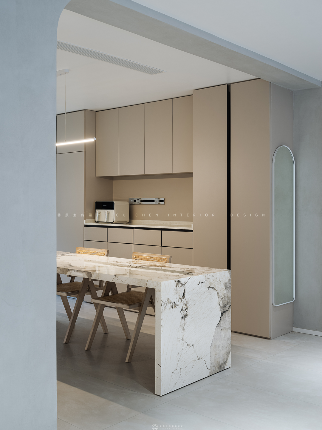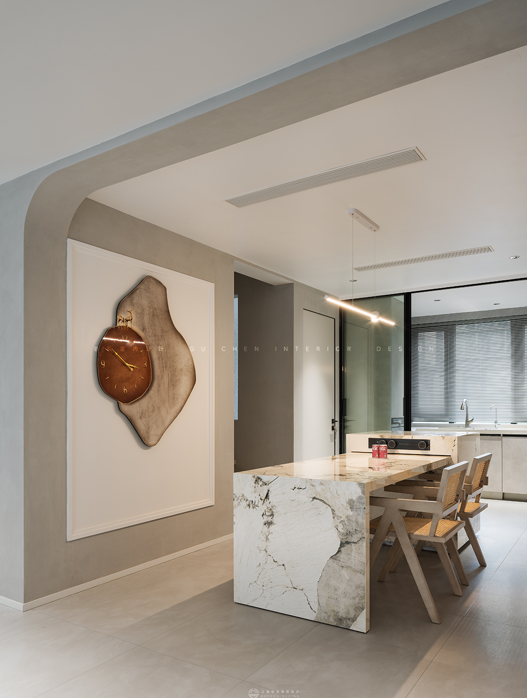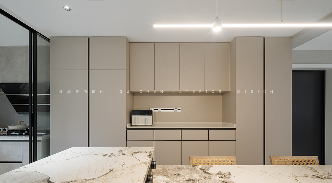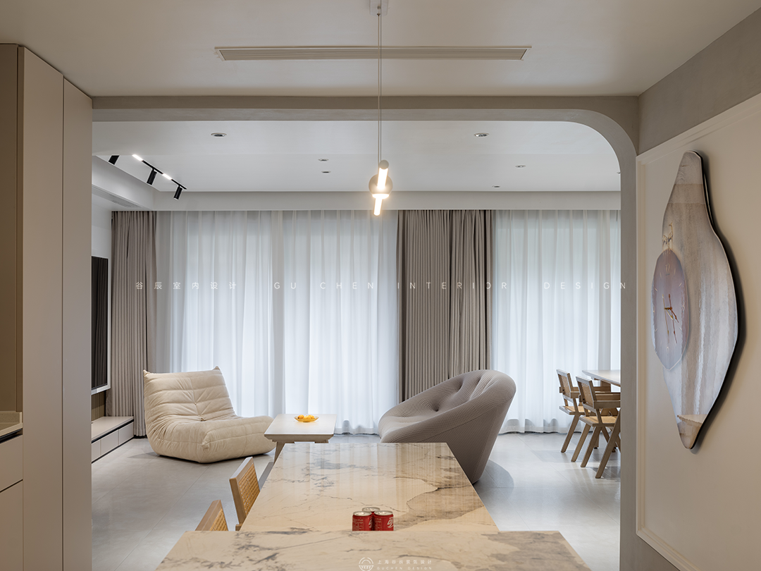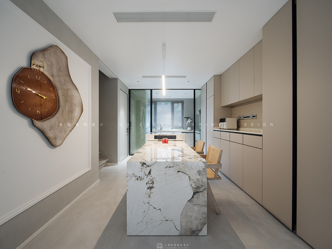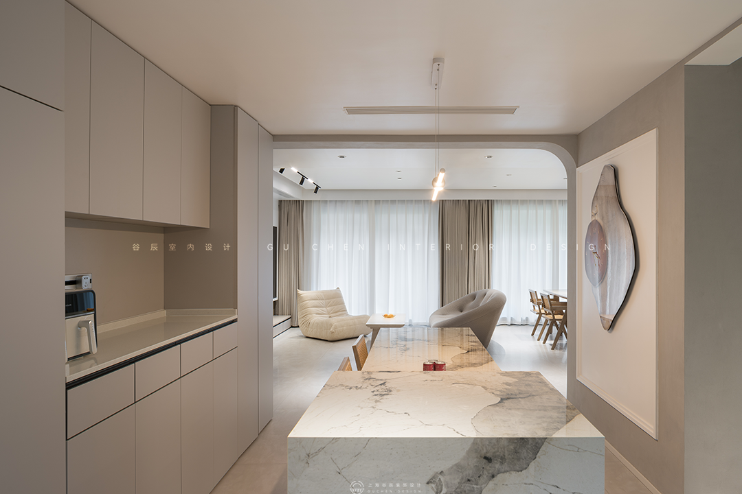 弧度框出餐厅区域,奶油色贯穿到底,轻纱幔帘遮挡住大面积落地窗户,当日光倾泻,光线若隐若现散落在餐桌上,目光所及之处弥漫着暖意。 03中岛 「现代极简,一念淡然,一念清净」