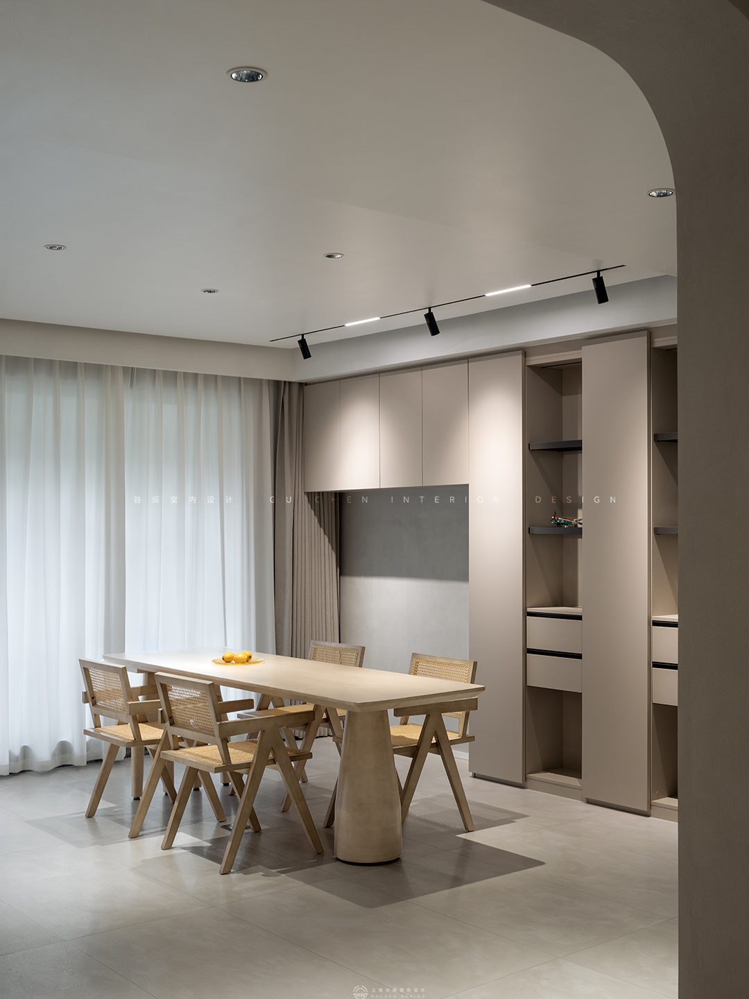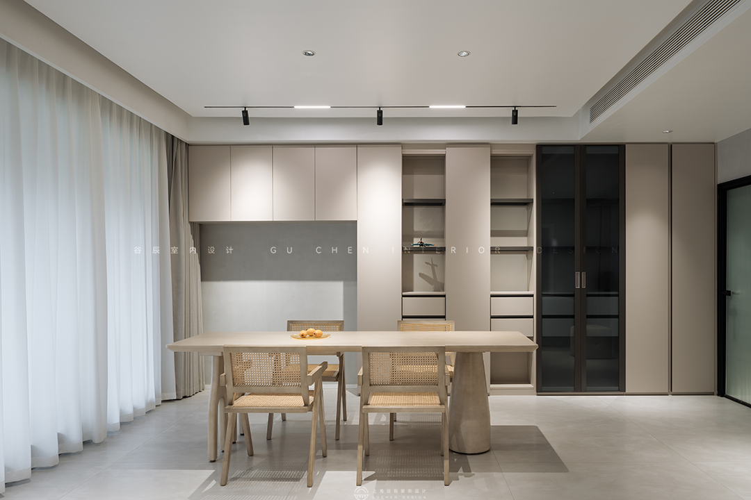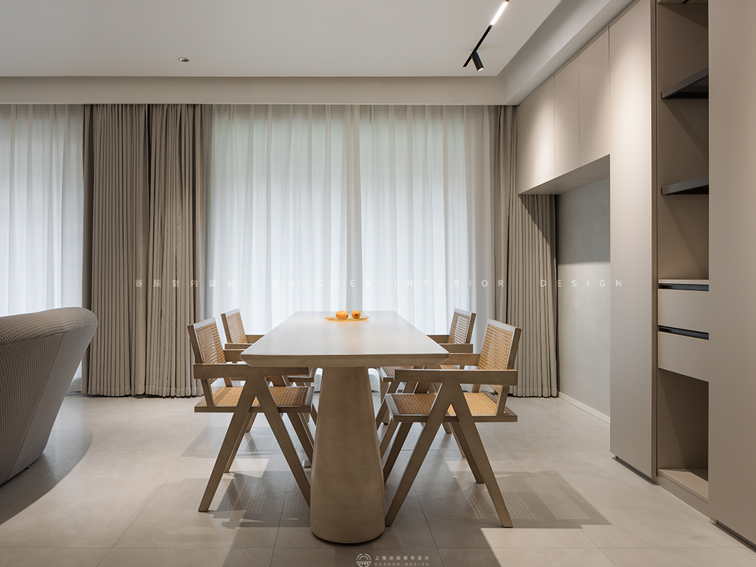 餐厅更多是休闲的现代风格,既能用餐也能作为夫妻和小孩的休息区,摆上一盘清甜多汁的水果,家人闲坐,浅笑声声。旁边轻盈柔美的窗帘更增加温馨感,打造不被打扰的静谧空间。