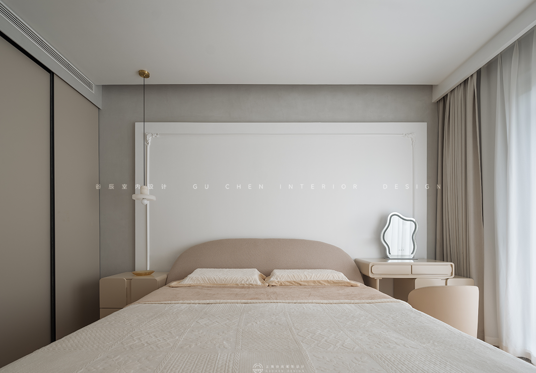 主卧选用原木色与浅灰色作为空间的主色调,营造温馨舒适的休憩空间。富有设计感的吊灯选用铁质,吊顶用了金色,增加了空间的层次感与灵动性,不规则的梳妆镜是房间的亮点,原汁原味,色调和谐统一。