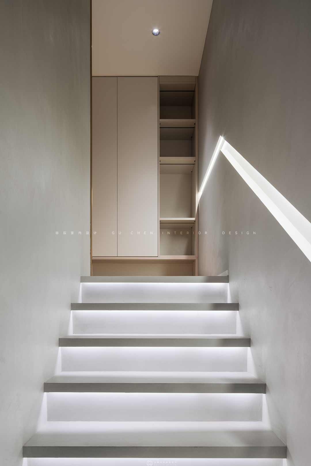 卫浴空间相对客餐厅更为素雅,清冷的灰调冲刷着平日烦躁的心灵,让人瞬间沉静下来,静享沐浴时光,淋浴区、如厕区、洗漱区功能划分、隔断明确,干湿分离,使用更安心。 08楼梯 「写意高级,赋予家更美好的想象」