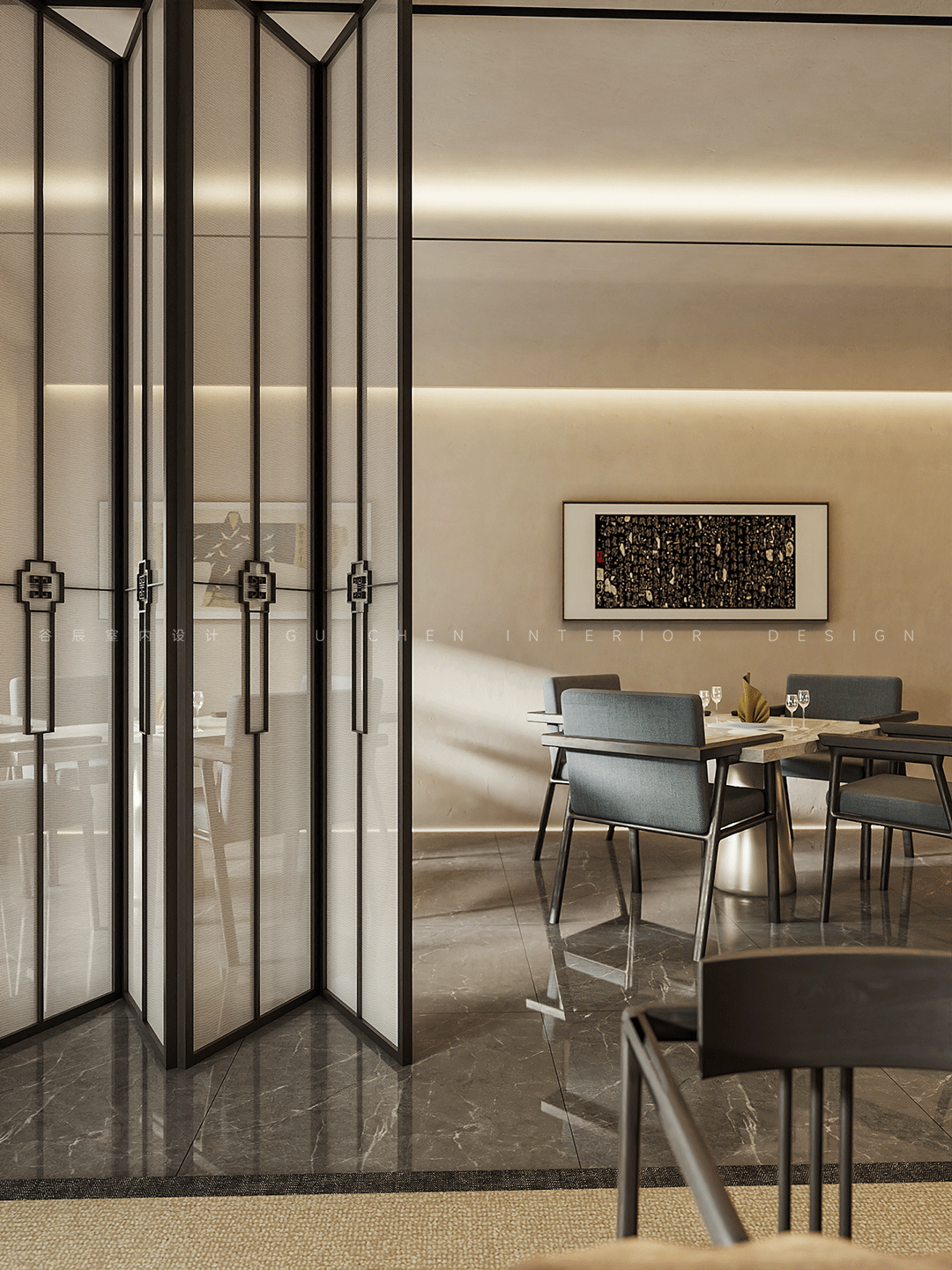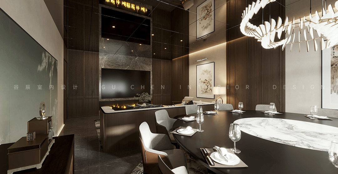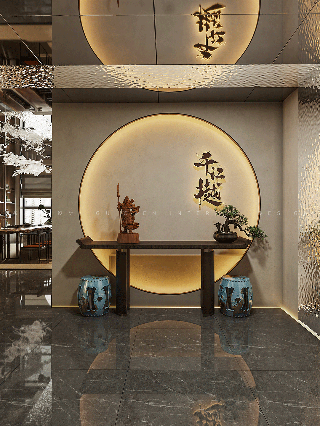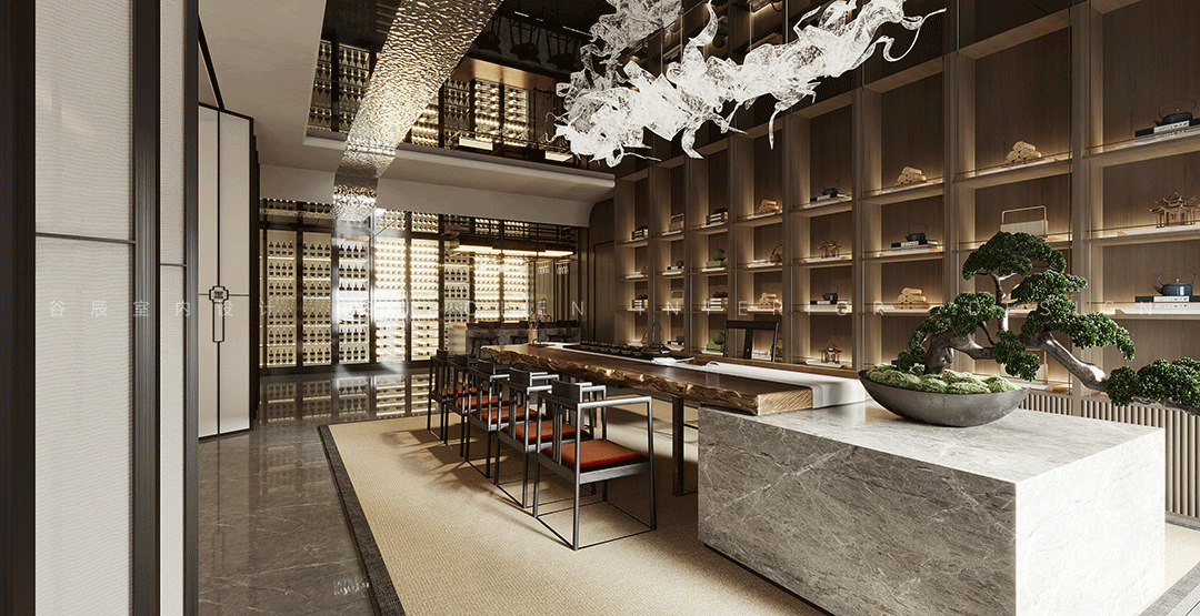 GU CHEN The story behind it 本期分享的屋主是此次改造的高级会所主理人,喜好中式的古典雅致,尤其还欣赏摩登的新潮与大胆,本案设计师将东方美学与摩登风格相结合,在当下现代主义设计语言中表达东方意境的美学体系,作为接待VIP客人的会所,设计师从室内、陈设到产品,规划会所的空间动线及整体设计,结合园林写意山水的精神,营造静与景的故事情节,筑就当代诗书画中的武陵桃源。 摩登东方追求与自然和历史的对话,放大细节是对美感的**追求 在有限的空间内体现山水的壮阔和辽远,传承了传统的绘画和美学底蕴 本案以摩登东方为设计的意向,加入设计语言进行修饰和升华,使其更加有节奏感,将提取和微缩后的山水意向集中到室内中去,营造出来的意境更加贴近自然,对应了这个作品的初心。 01玄关 「驰骋空间 揭开序幕」