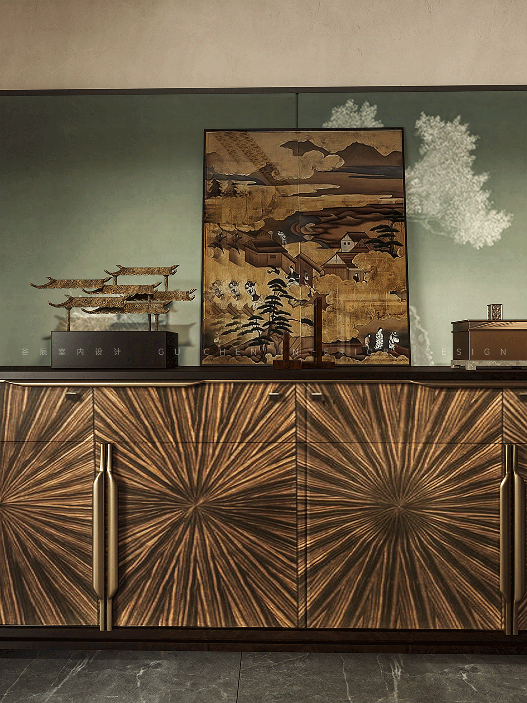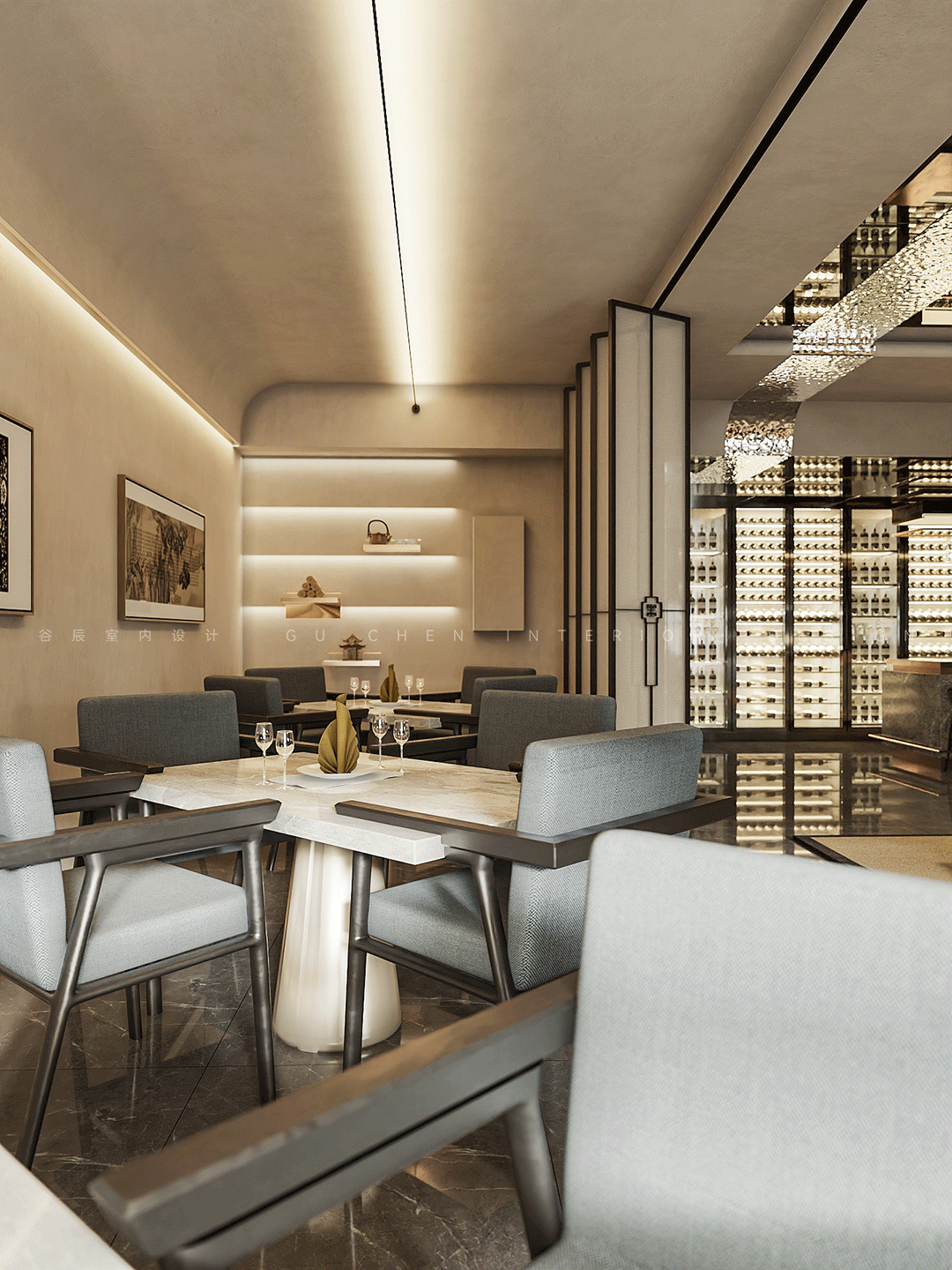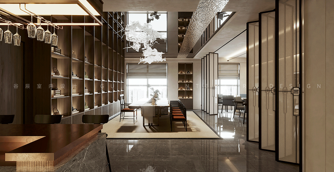 GU CHEN The story behind it 本期分享的屋主是此次改造的高级会所主理人,喜好中式的古典雅致,尤其还欣赏摩登的新潮与大胆,本案设计师将东方美学与摩登风格相结合,在当下现代主义设计语言中表达东方意境的美学体系,作为接待VIP客人的会所,设计师从室内、陈设到产品,规划会所的空间动线及整体设计,结合园林写意山水的精神,营造静与景的故事情节,筑就当代诗书画中的武陵桃源。 摩登东方追求与自然和历史的对话,放大细节是对美感的**追求 在有限的空间内体现山水的壮阔和辽远,传承了传统的绘画和美学底蕴 本案以摩登东方为设计的意向,加入设计语言进行修饰和升华,使其更加有节奏感,将提取和微缩后的山水意向集中到室内中去,营造出来的意境更加贴近自然,对应了这个作品的初心。 01玄关 「驰骋空间 揭开序幕」