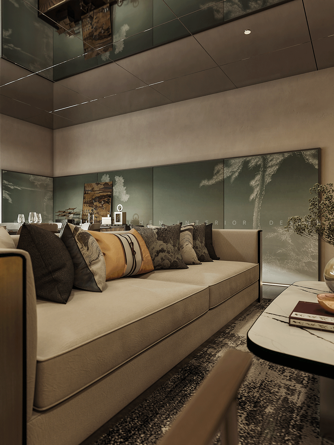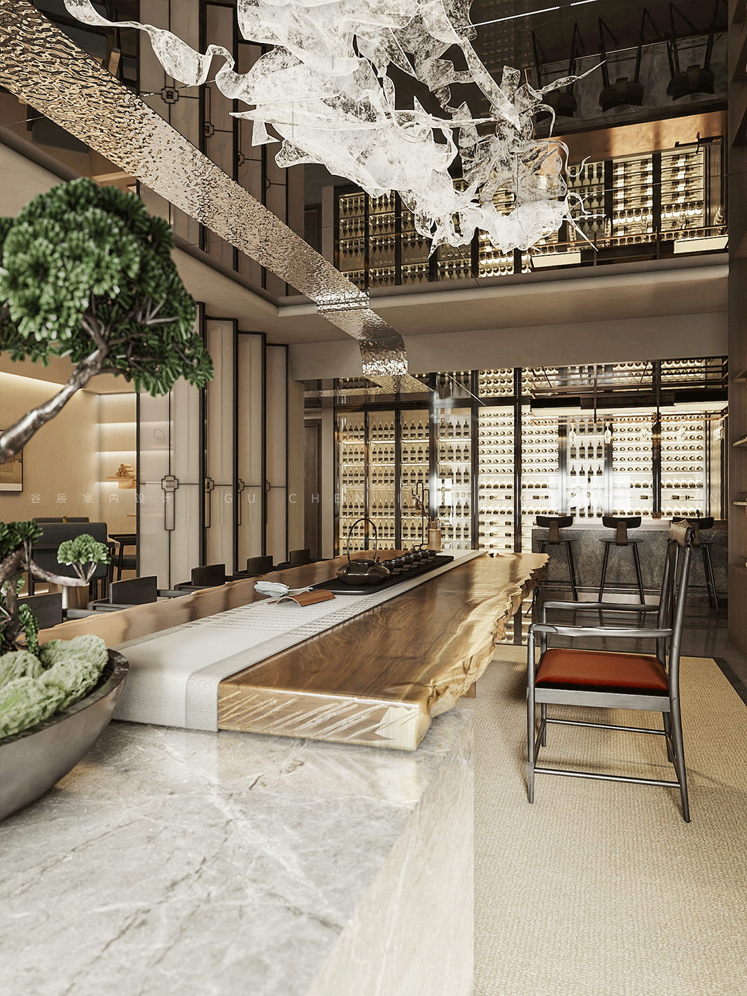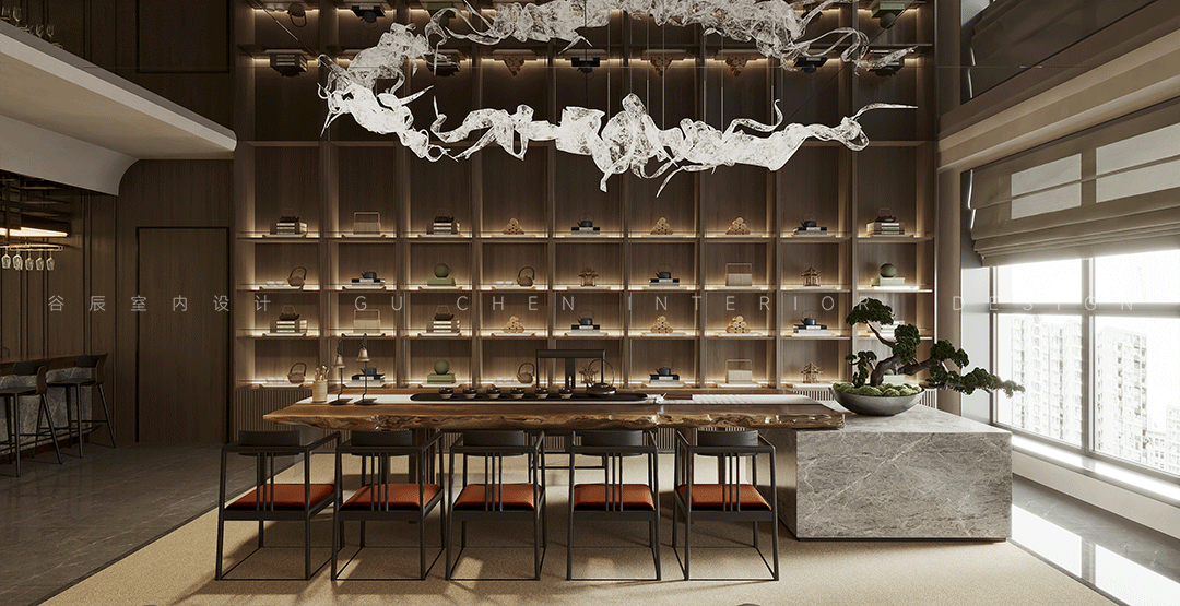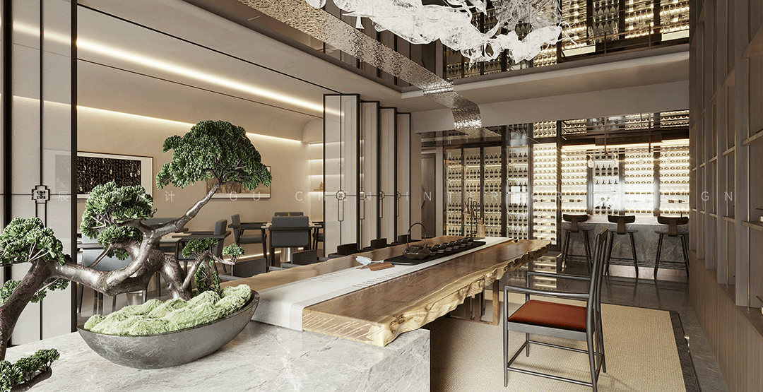 入口玄关处选以沉稳的大理石和木块打底,大面积的水波纹镜面从高空垂下,圆形立体墙面上的logo与桌面的中式摆件形成空间立面的装饰肌理,以低调奢华的空间拉开室内的序幕。 02 茶室 「西方的沙龙聚会,东方的曲水流觞」