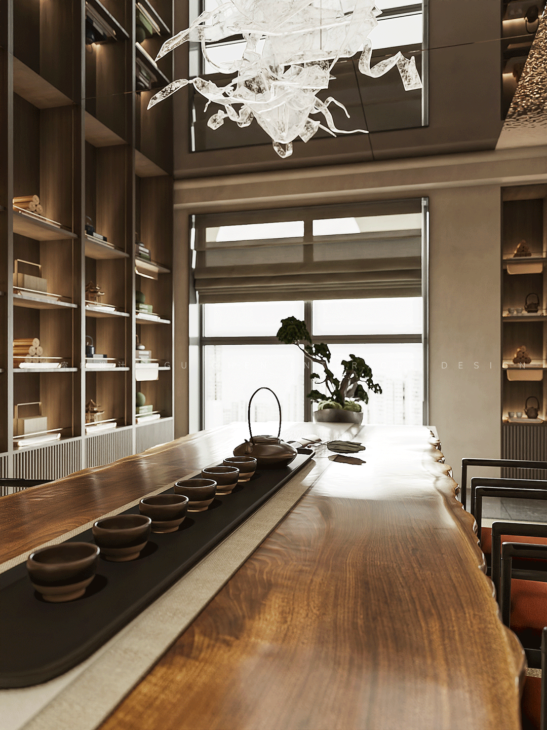 软装呈现出的依然是微缩山水,以小见大,有限的空间装载着无穷尽的山水意向,赋予了更多的层次,这样的设计拉近了人与自然的关系,为这个空间带来了生机与活力。