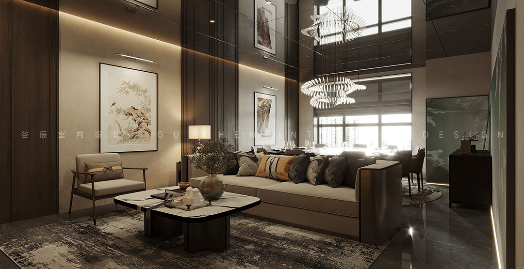 热衷于收藏工艺品与博览群书是本案业主的喜好,因而包含了更多文化艺术的精神外显,墙上挂着精美的花鸟画便是**的体现。大厅大量采用深胡桃木色自然材质装饰空间,将古朴的东方意境同现代基调复合,外方内圆融会贯通,设计手法克制而内放,展现出历久弥新的韵律之美。