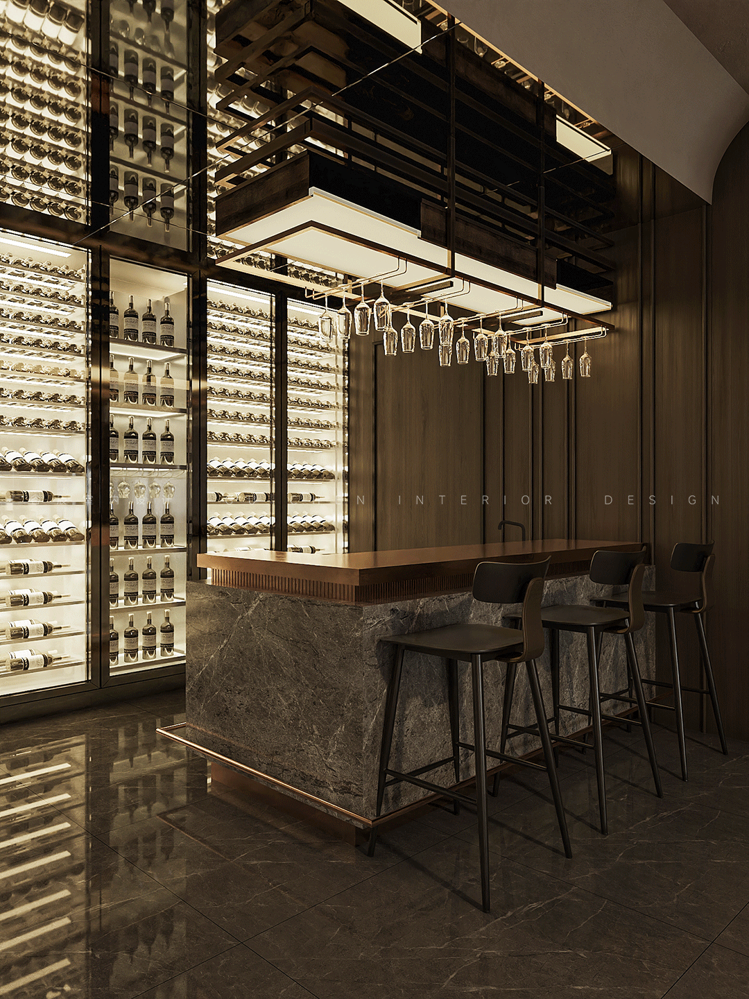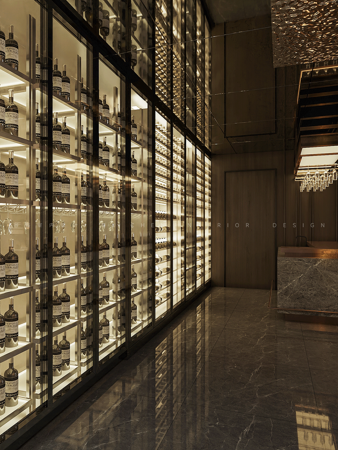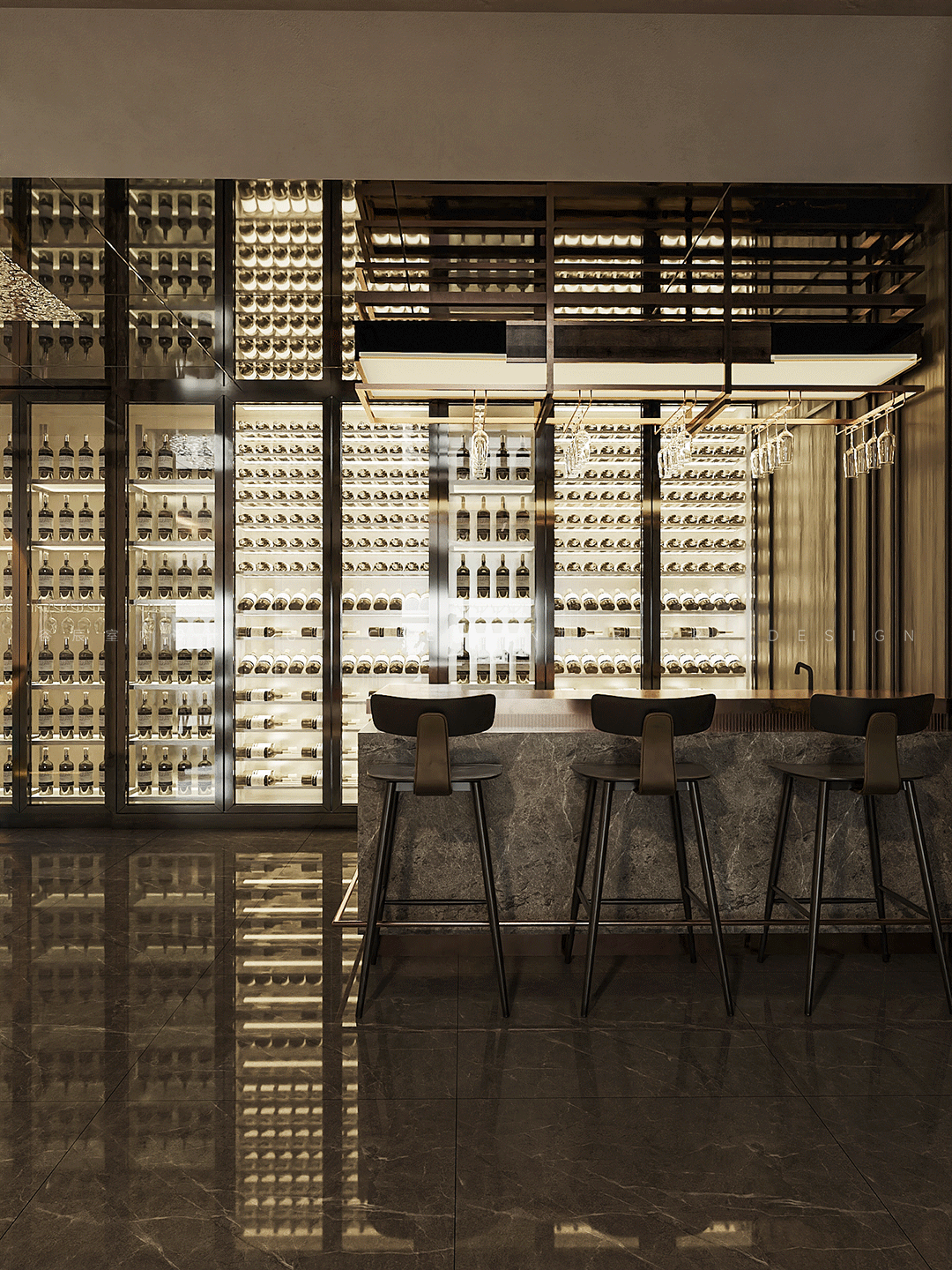遵从“少即是多”的设计理念贯穿其中,毫不犹豫地去除一切冗余的装饰,营造出一所通透明亮的雅士藏酒室,整墙的气派透明玻璃柜,明亮的灯光点缀其中,大理石地板清晰的反射出这些名贵藏酒的影子,静静的任由顾客享用。