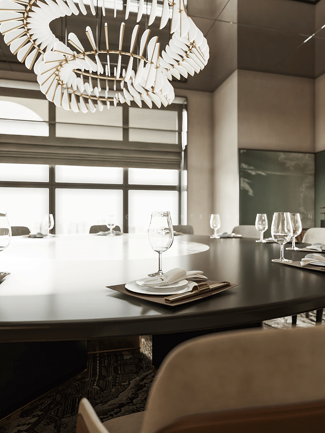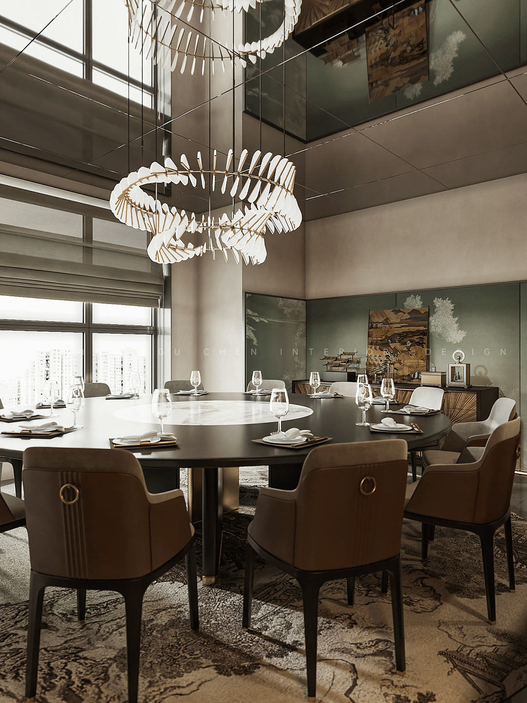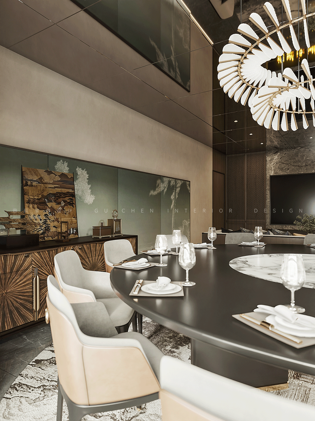 背后便是宽敞的大圆桌,吊灯上瓷片轻盈如鹅毛,用小体量抵消了大重量灯具的笨重,桌面是名贵的檀木,色纯而富有温润的光泽,麂皮磨毛靠背椅完美搭配,餐具整齐划一的摆放着,静静等候着尊贵的客人。