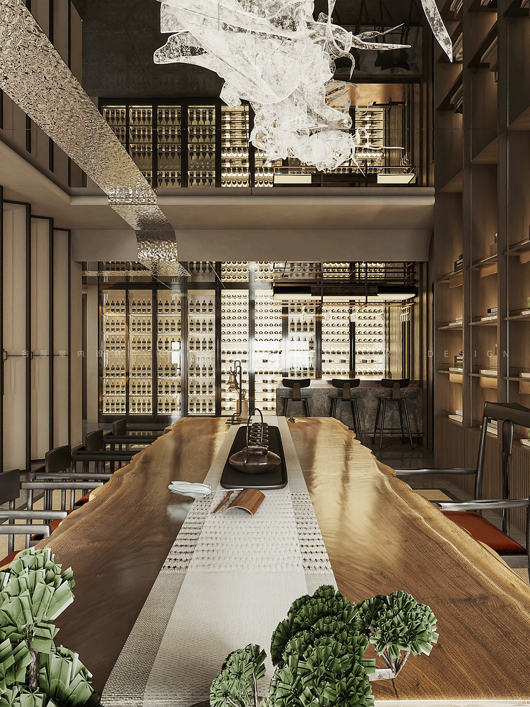 墙上的装饰画选择了新颖的西式立体手工贝壳画,与全屋中式元素中和,桌面折好的精致餐巾和擦得明亮的高脚杯,一切张弛有度,纯粹有序,在沉寂自然的氛围中棕黄色鲜明的点缀,透露出幽深的高贵感。 04酒室 「大隐于市,朝暮人间」