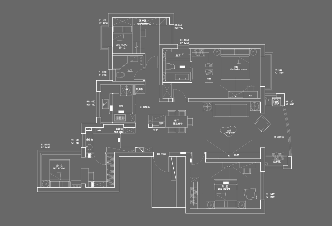 一字型动线设计方便不拥挤,利用素色与自然光去装扮生活,摈弃传统法式的华丽与古典,让现代设计的简约成为潮流,岩板、木饰面与线条碰撞出丰盈且多维的美感,靠墙设计的落地式餐边柜,以暗色木为柜门,悄然释放出简约的高级感。 04主卧 「雅致中自带慵懒情调」