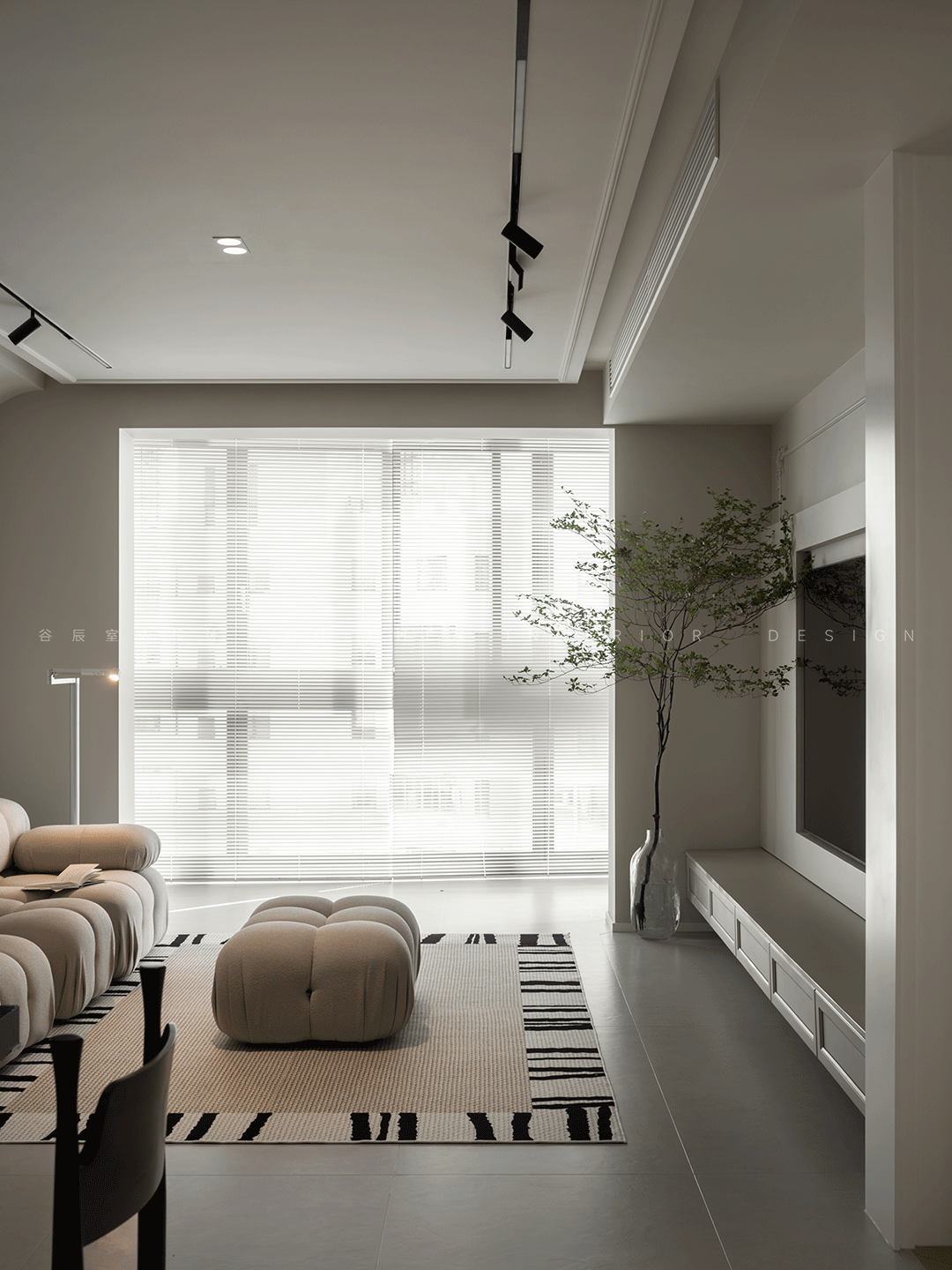 造型圆润可爱的沙发让客厅看起来温馨舒适,地毯是时尚的亚麻编织斑马纹花样,整体照明为无主灯设计,电视墙下方柜子做悬空设计,方便打扫。