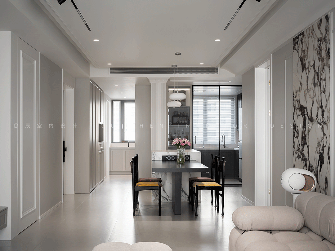 装饰墙面用了小面积的水墨晕染大理石纹,既彰显了珍贵的历史感,又为家人提供了雅致舒适的空间。