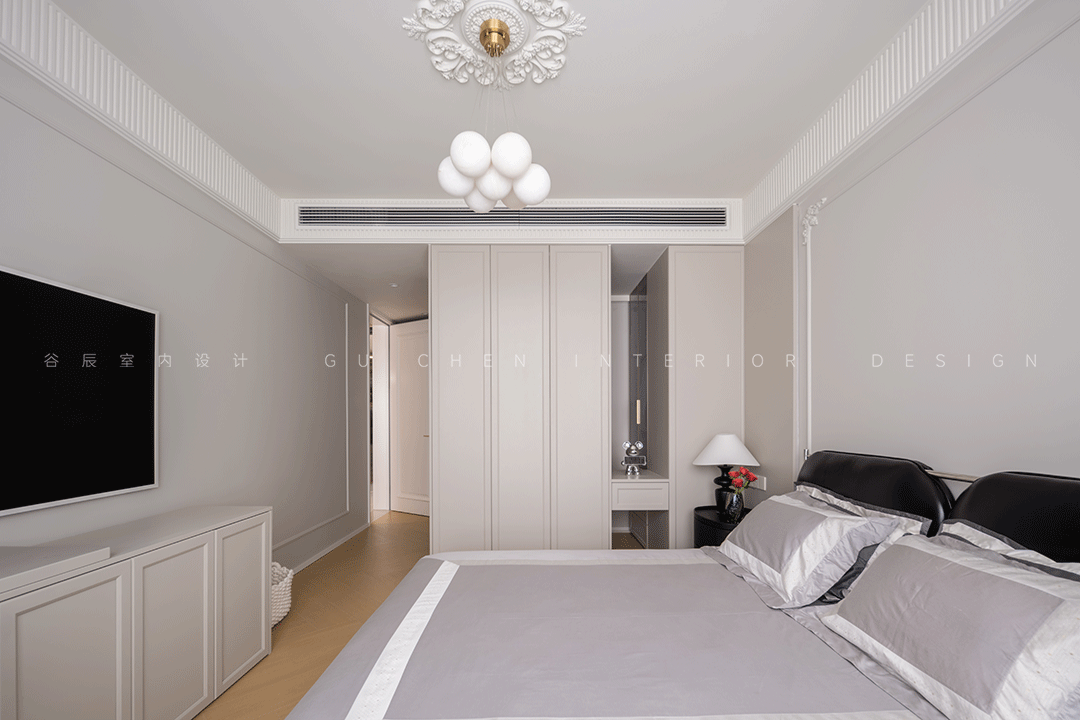 主卧内一块区域作为衣物的收纳柜,隐形门设计美观实用,吊灯上精致的雕花与像气球般梦幻又像花瓣一样柔和的白色灯泡,起承转合间,传递着微妙的浪漫因子。