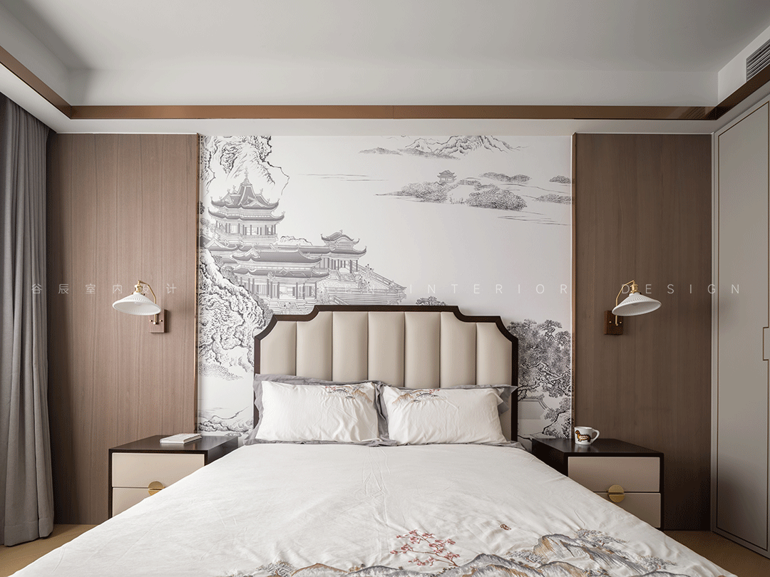 打开房门,其中竟然是雅致的中式风格,全屋以棕色为主色调,床头背景墙是水墨风的山水画,床品上印着的花鸟画与其相呼应,整体空间端庄古朴,松弛自然。
