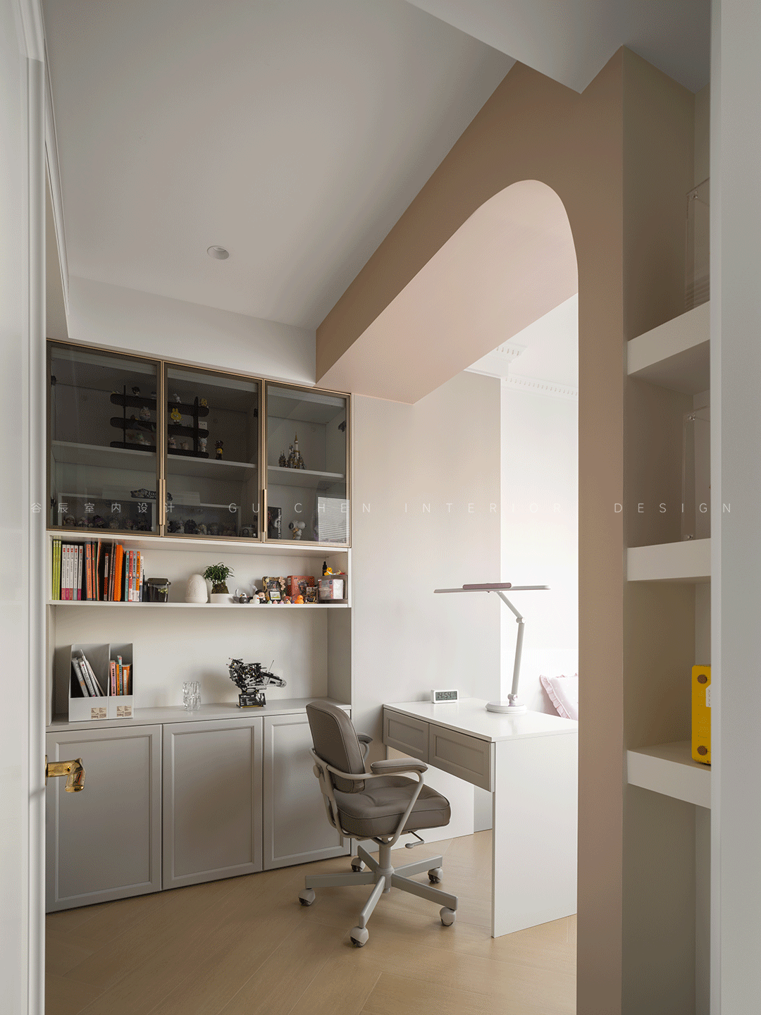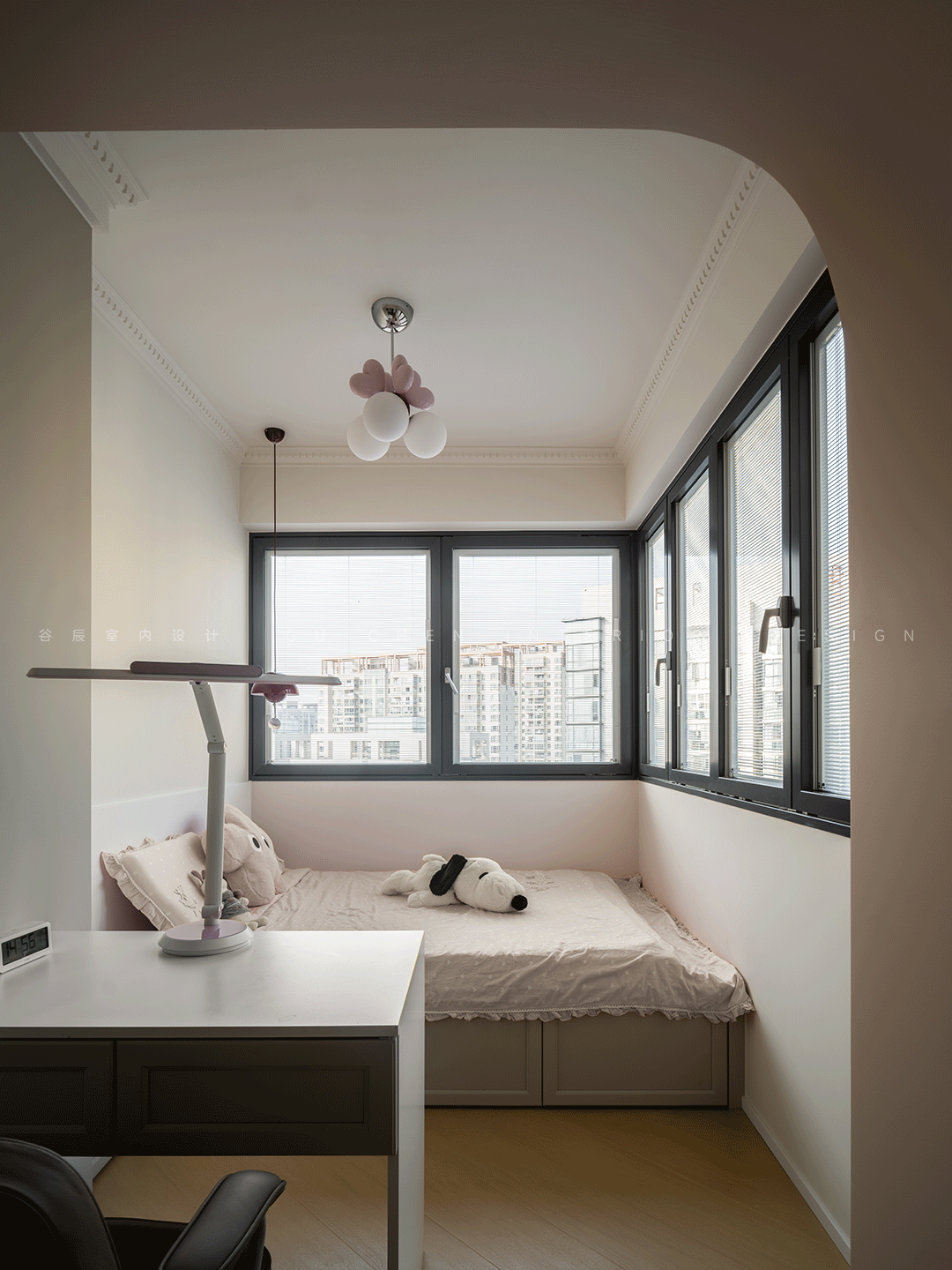 融入奶油风格,融合温馨的低饱和度粉色,整排储物柜与学习区满足儿童房功能,拱形壁龛内后期可安排学习桌,同时释放出更多的活动空间,及简约优雅的法式弧形造型,完美的契合了屋主对女儿房的向往。