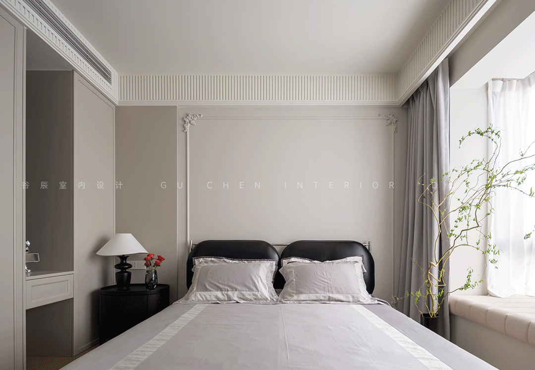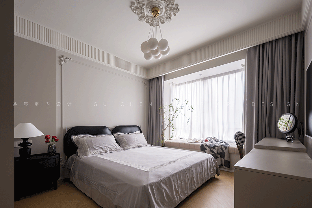 飘窗上随意摆放的菱形黑白格子毛毯与化妆桌的椅子花纹相呼应,化妆桌上摆放着精致小巧的黑色梳妆镜,无处不透露出对生活的热爱。 05次卧 「法式浪漫情怀里,注入东方情愫」
