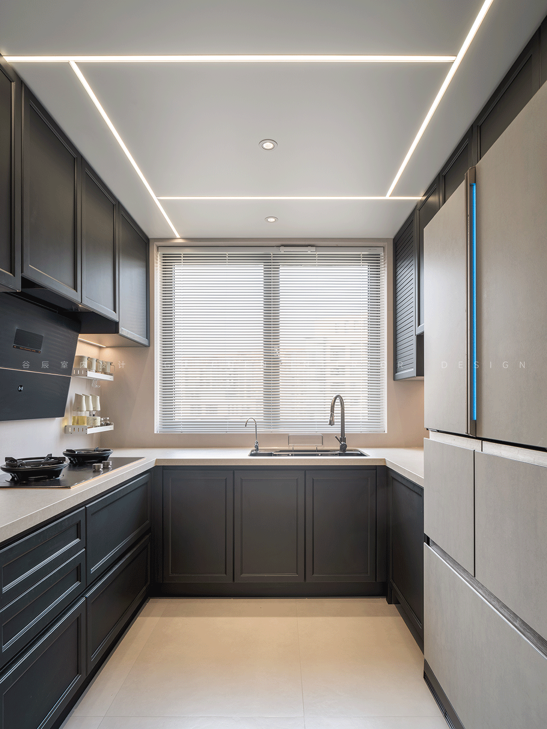 色彩搭配上设计师精心挑选了明黄色与洋气的皮粉色坐垫的靠背椅,搭配黑色的漆面餐桌,高级而不跳脱,瞬间衬托的空间活泼而不失端庄典雅。 03厨房 「简奢的质感之美」