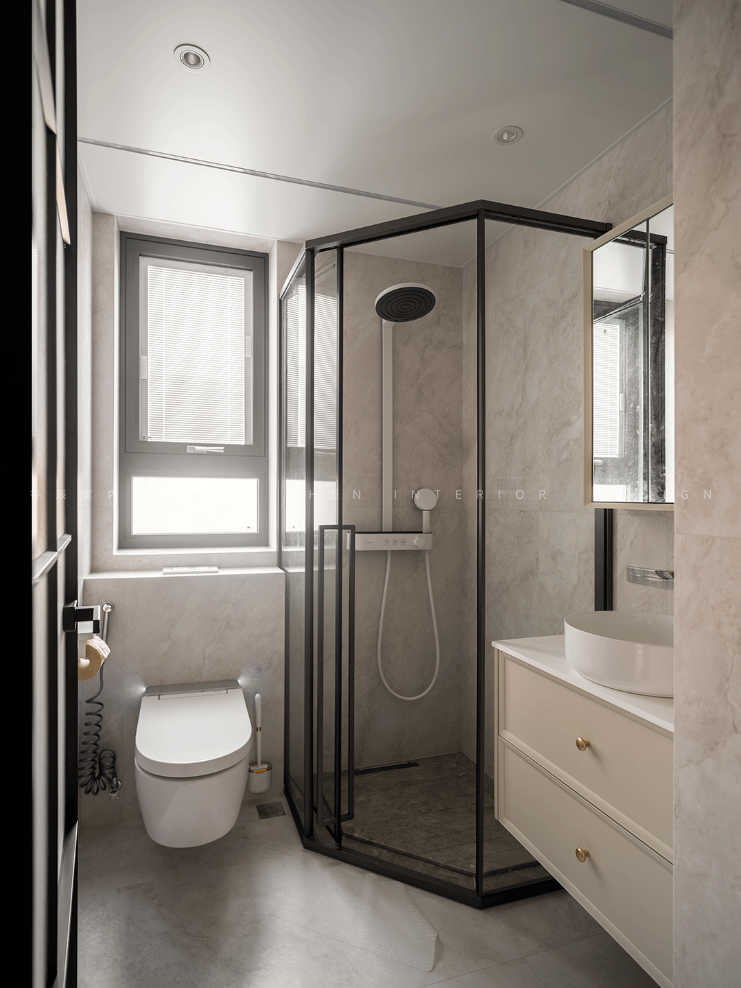 床铺在安心舒适的观景窗旁边,粉嫩带花边的床品搭配可爱的玩偶,用奶油色的高级质感辅助精致圆润的线条,搭配热门的法式元素、几何美学的碰撞,让法式精致与复古氛围完美融合是艺术与审美的浪漫体现。 08浴室 「方便实用,简约轻奢」