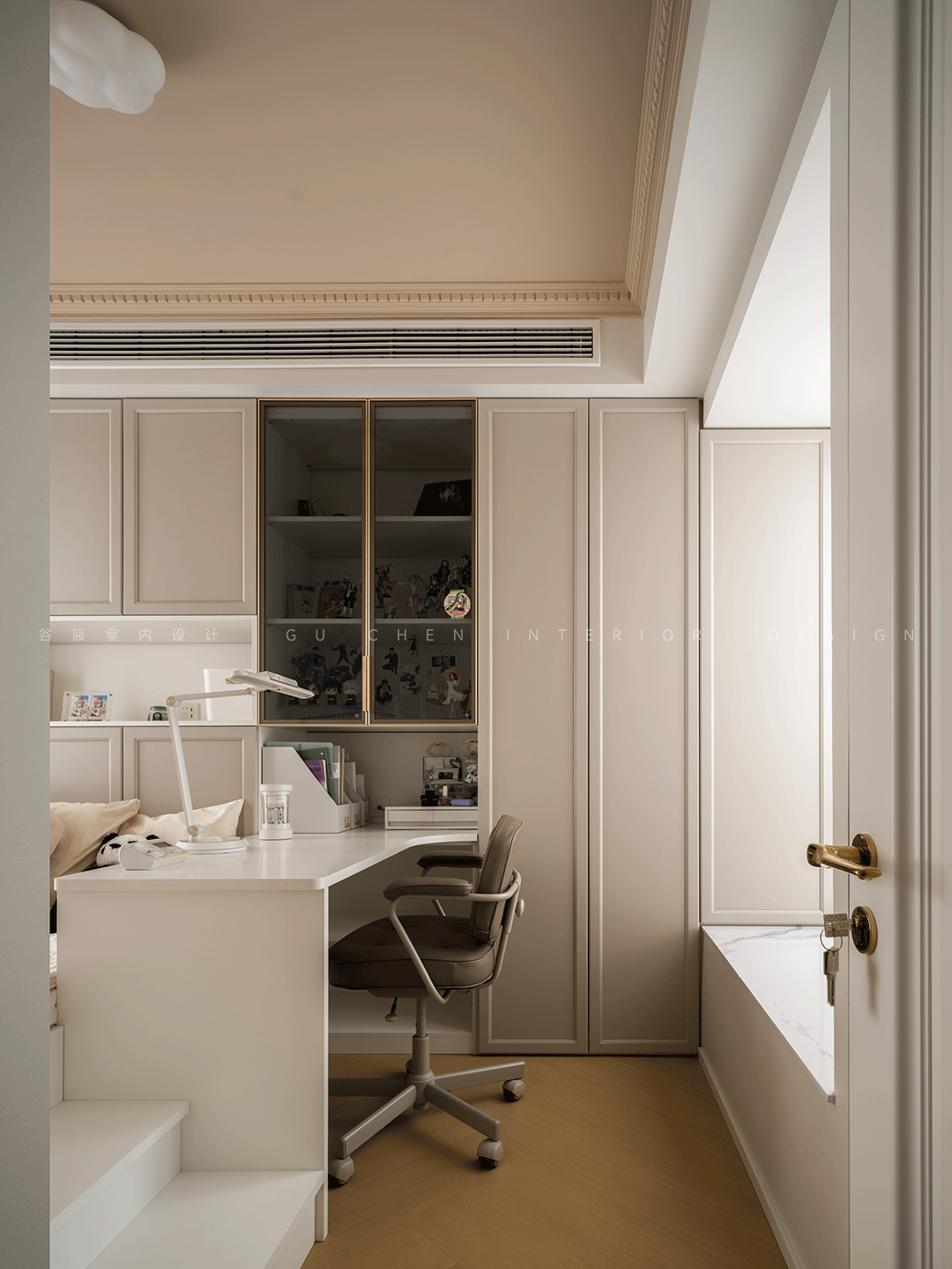 以米白色为主调,呼应客厅的手法,充满了童趣和法式浪漫的轻法式女儿房,整面定制的储物搭配透明玻璃展示柜,灰色玻璃镶嵌金边,精致而华丽,飘窗引进温馨的光线,为小女孩的童话世界打下柔软的光晕。