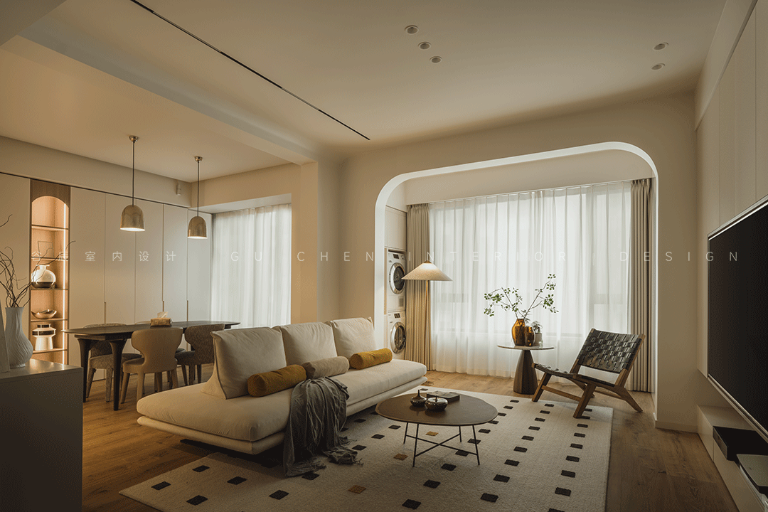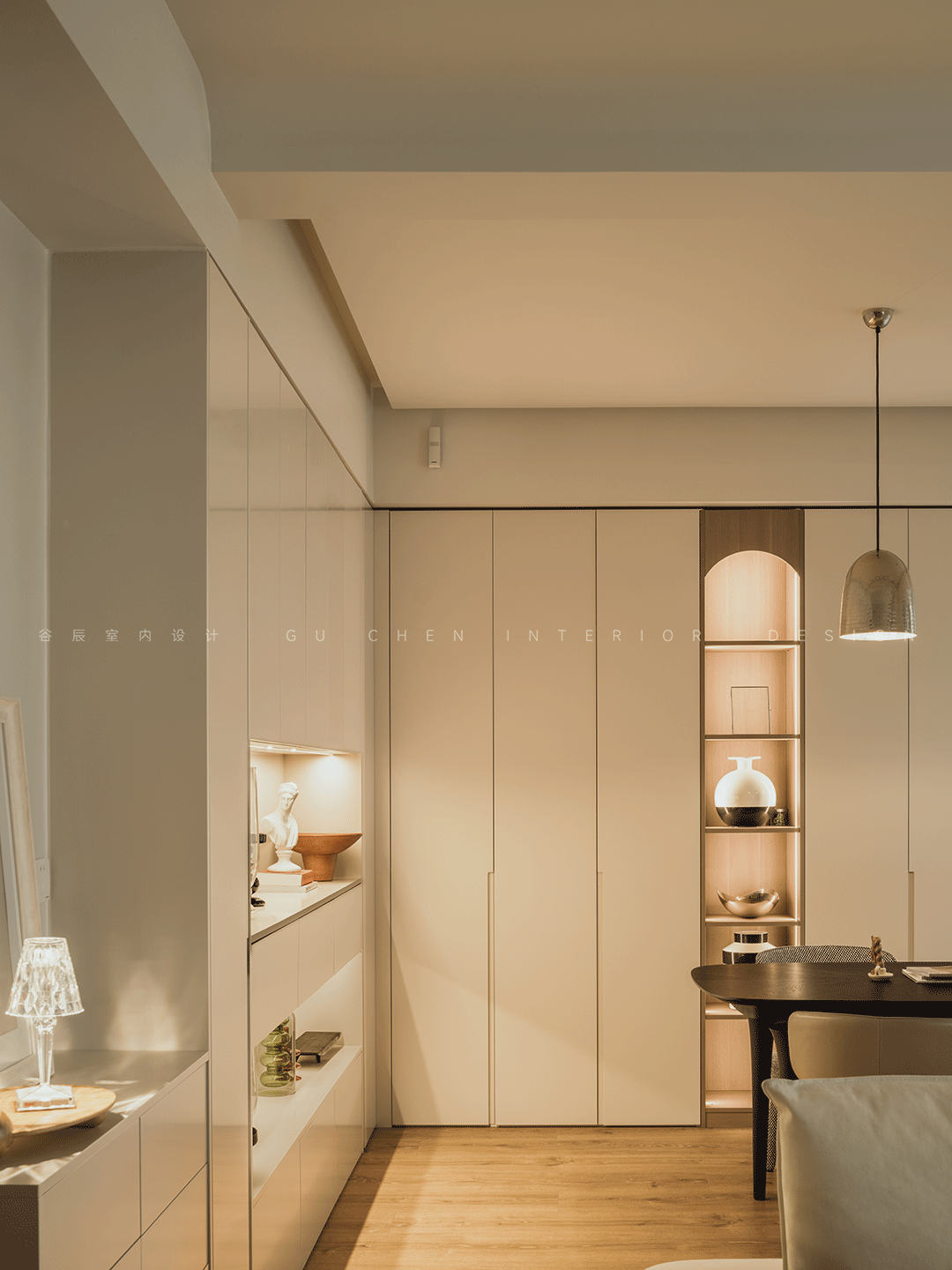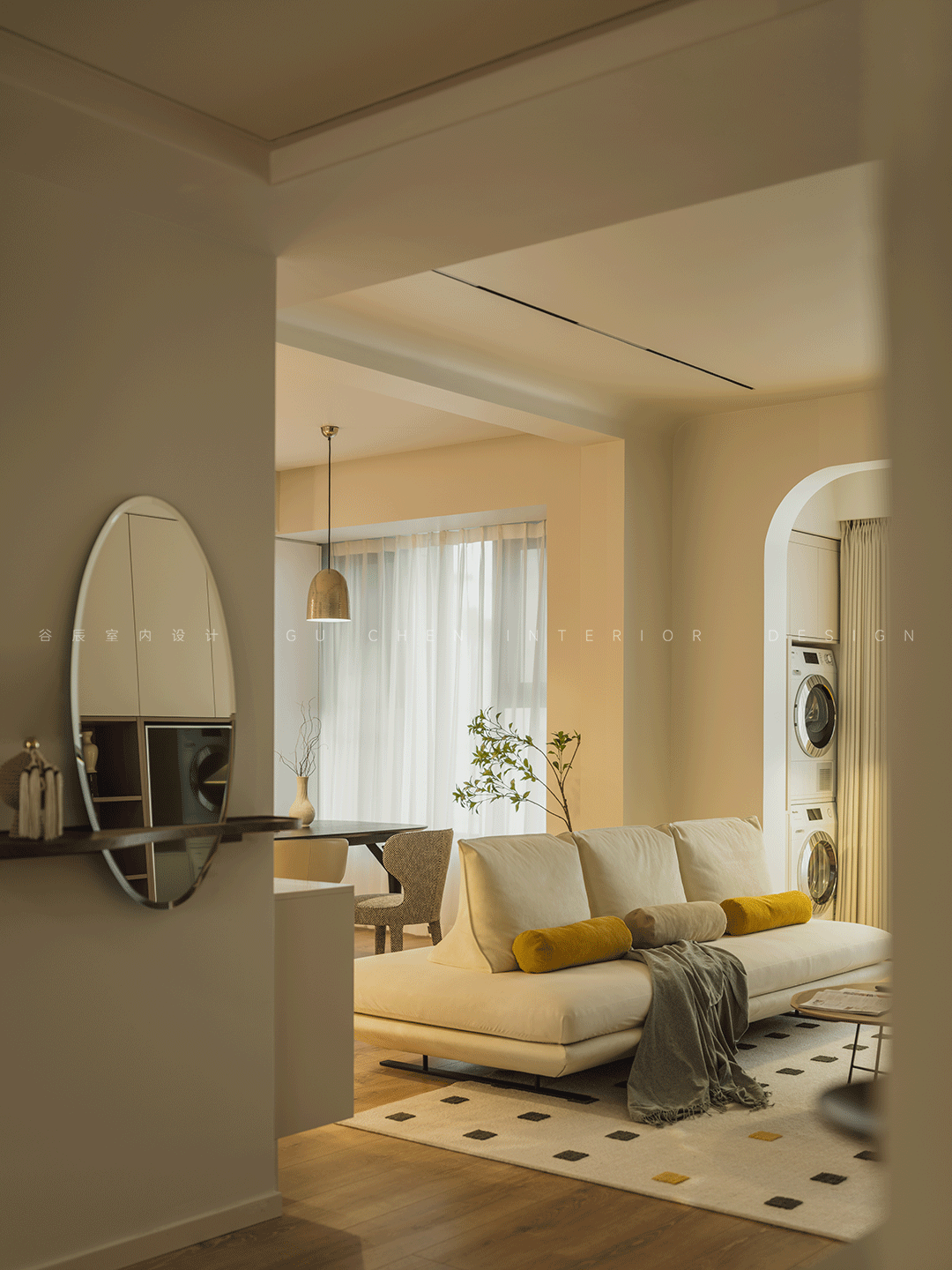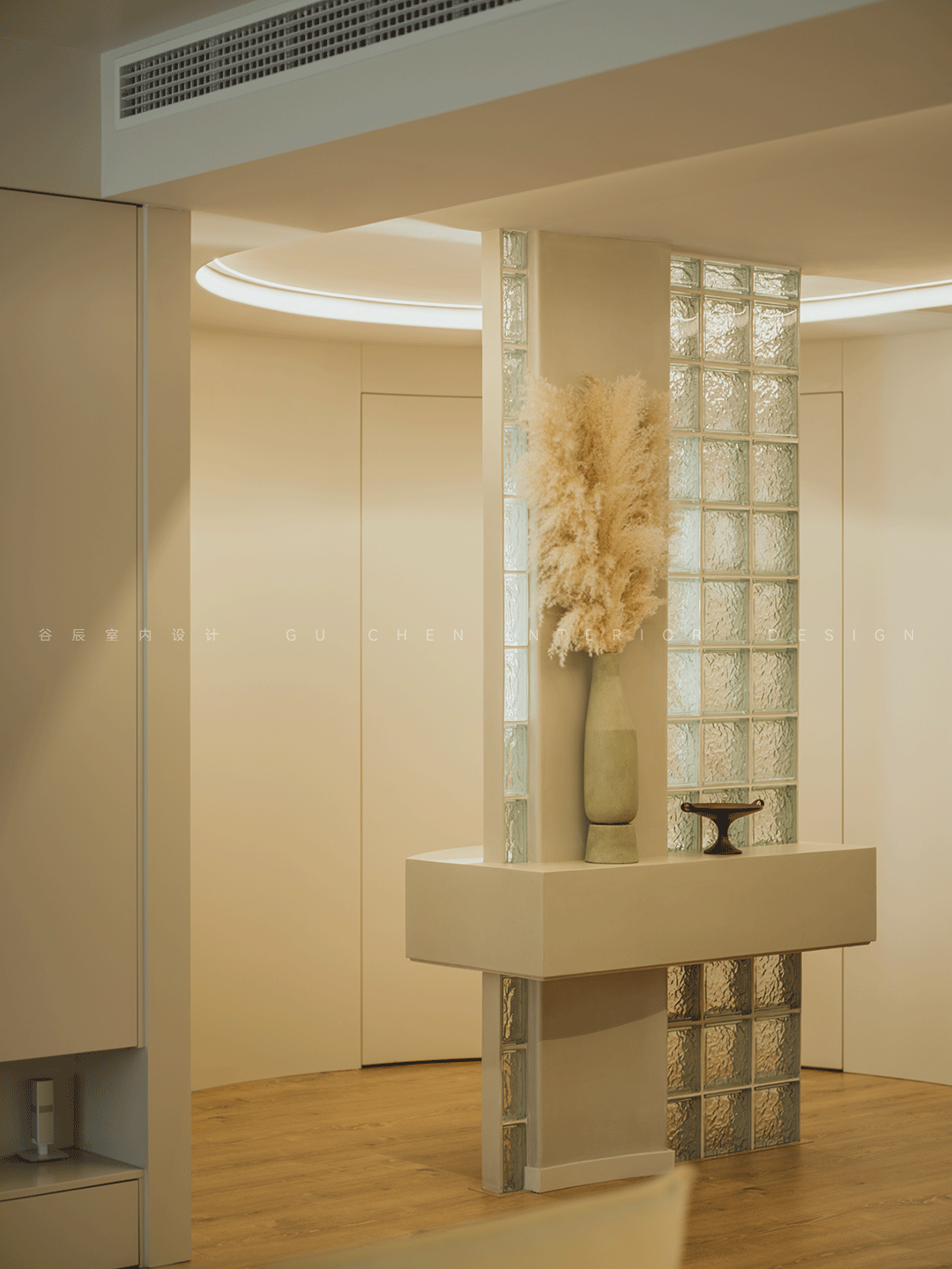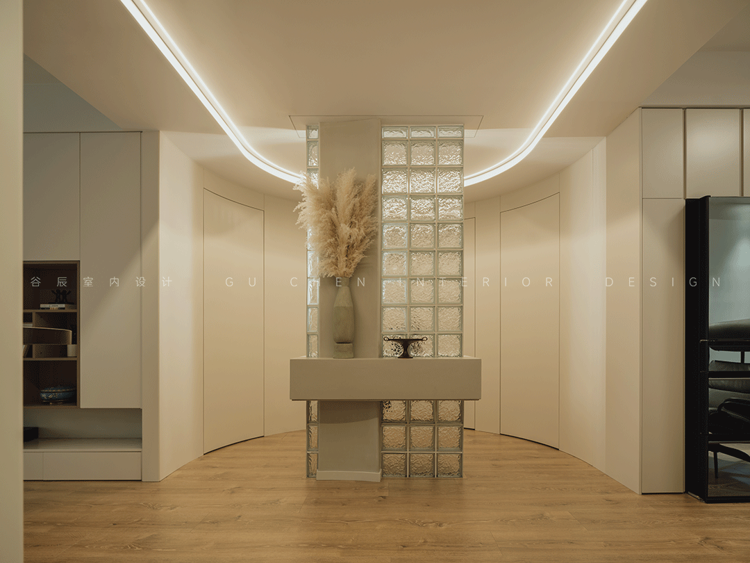 GU CHEN The story behind it 本期分享的屋主是一位70后成功男士,夫妻二人居住,喜欢干净明亮的感觉,因此设计师删繁就简,减少不必要的装饰,采用米白色作为主色调,用暖色作为点缀,让空间在宁静之余增添了生活的厚度,让整个空间既简洁又舒适,处处有美有温度。设计师在玄关的弧形设计,打破常规,是空间中的点睛之笔。房顶的弧形造型与动线相协调,整个空间的环绕感,为回家增添了一份温馨柔和仪式感,赋予了整个空间独特的延伸感和美感。 主卧室、衣帽间以及其他房间的门都采用了弧形的墙面设计。这不仅要求门的精心定制,还确保墙面颜色与定制柜子和家具相得益彰,以维持整体的和谐。这一设计元素为住宅注入了别致的美感和一脉相承的风格。 01玄关 「爱这股幸福氛围,更爱这份仪式感」