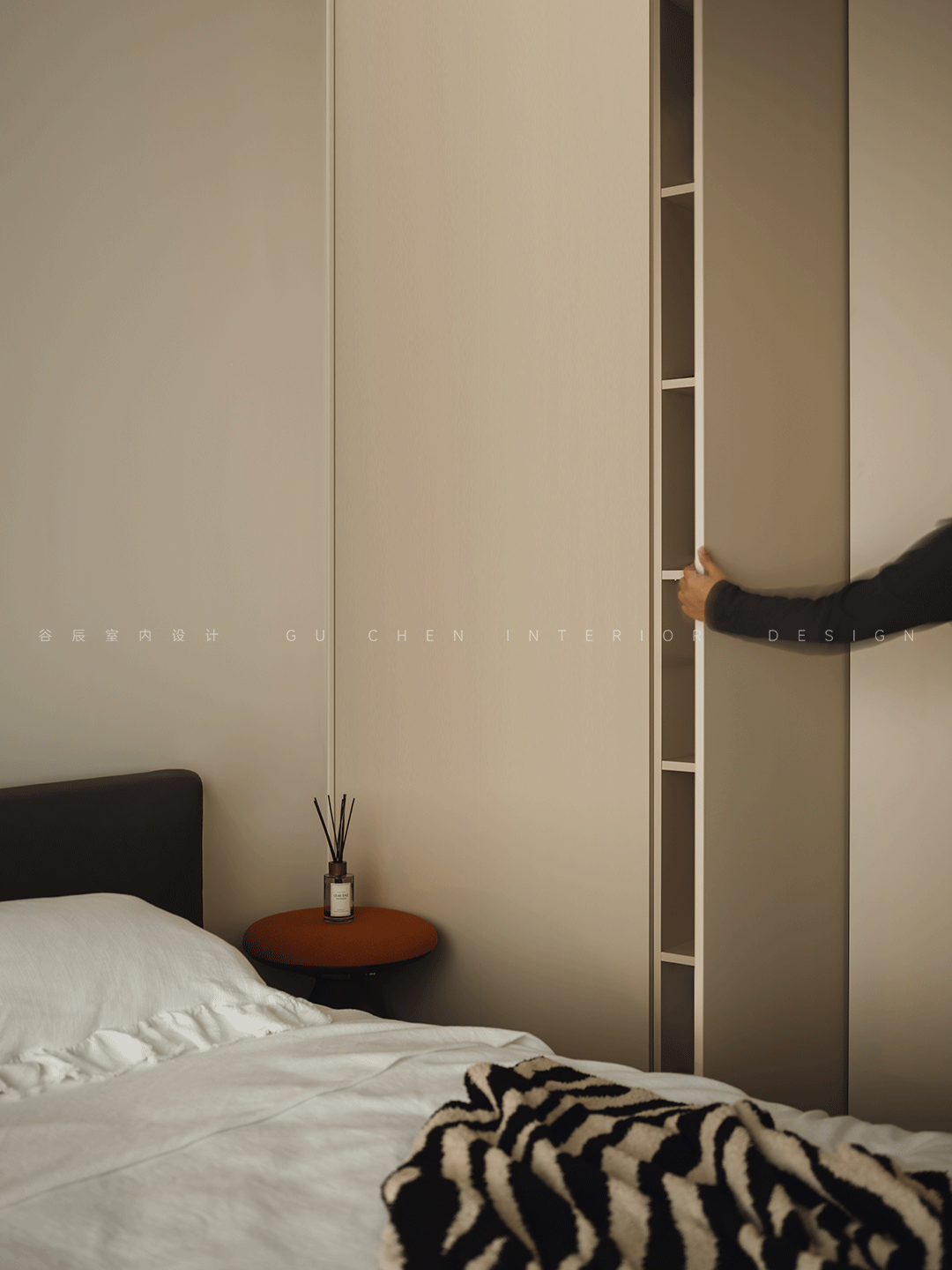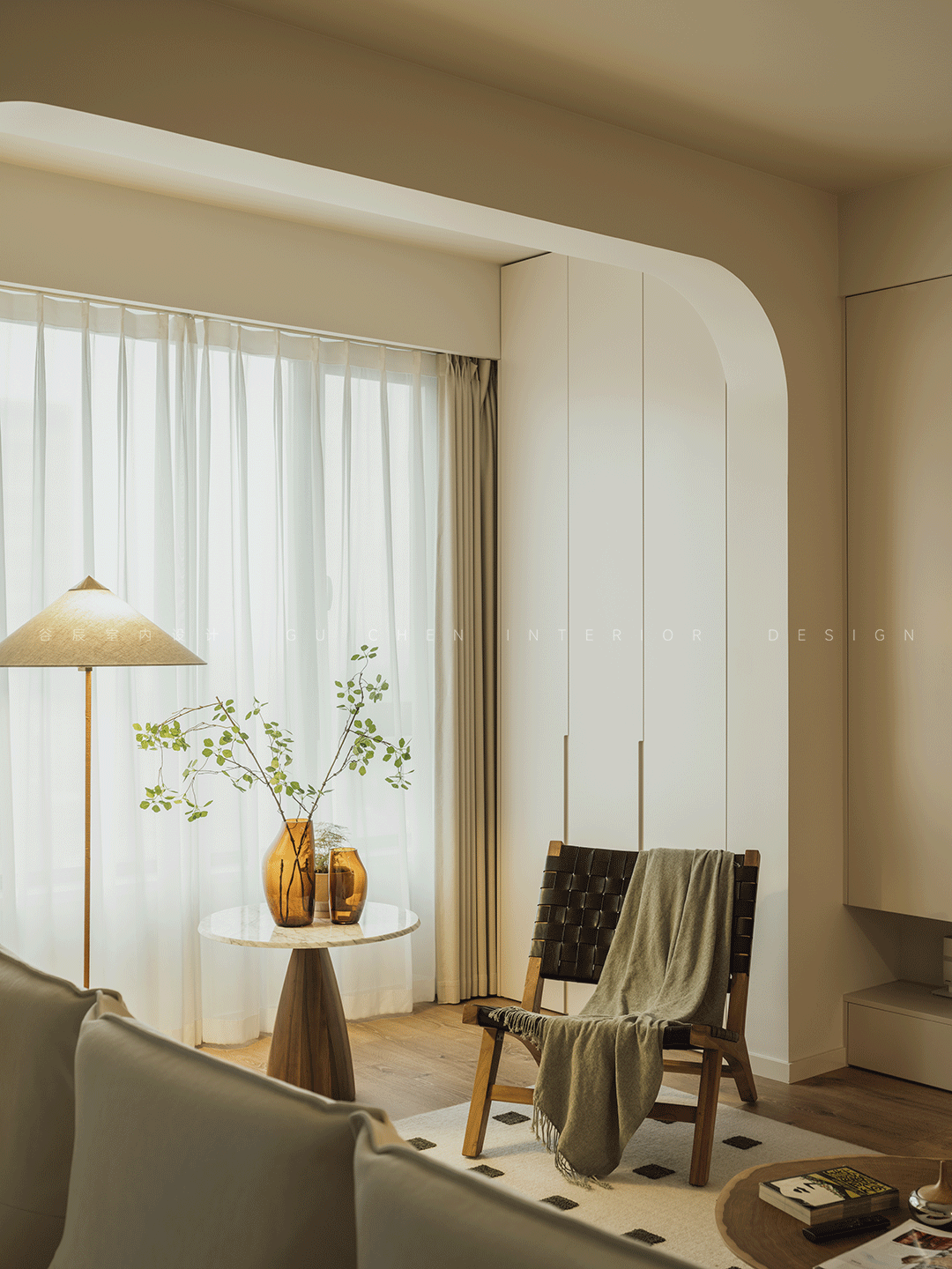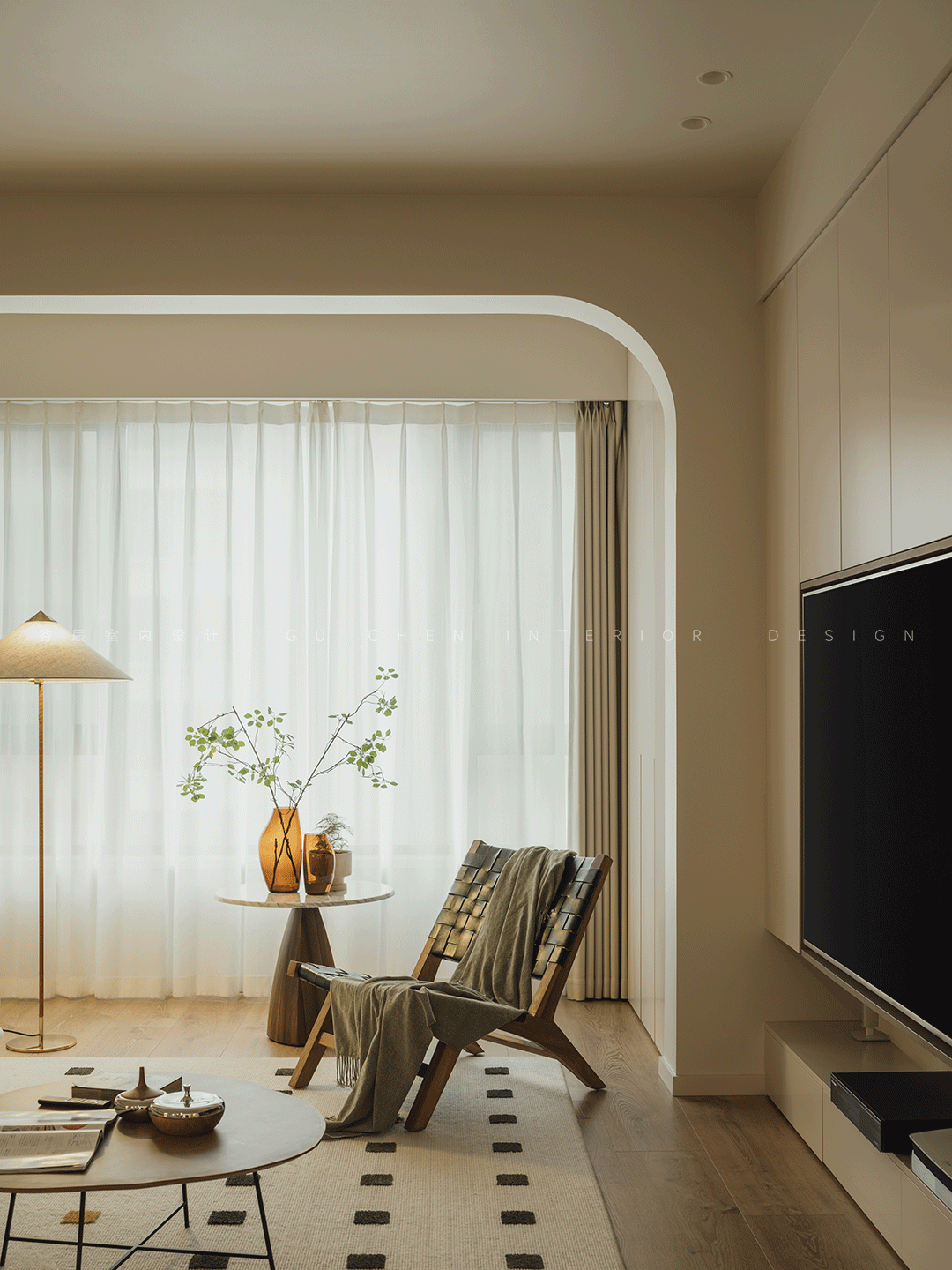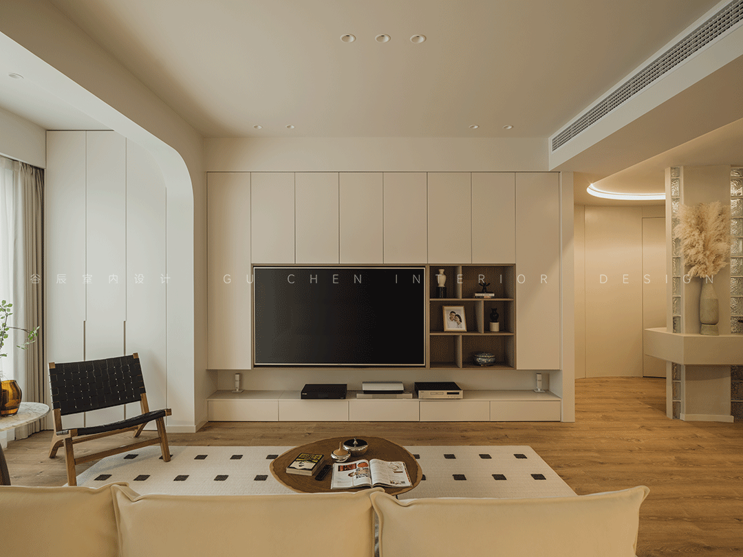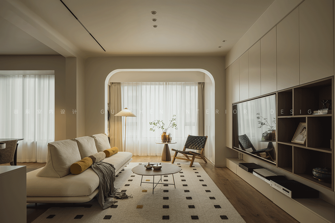 GU CHEN The story behind it 本期分享的屋主是一位70后成功男士,夫妻二人居住,喜欢干净明亮的感觉,因此设计师删繁就简,减少不必要的装饰,采用米白色作为主色调,用暖色作为点缀,让空间在宁静之余增添了生活的厚度,让整个空间既简洁又舒适,处处有美有温度。设计师在玄关的弧形设计,打破常规,是空间中的点睛之笔。房顶的弧形造型与动线相协调,整个空间的环绕感,为回家增添了一份温馨柔和仪式感,赋予了整个空间独特的延伸感和美感。 主卧室、衣帽间以及其他房间的门都采用了弧形的墙面设计。这不仅要求门的精心定制,还确保墙面颜色与定制柜子和家具相得益彰,以维持整体的和谐。这一设计元素为住宅注入了别致的美感和一脉相承的风格。 01玄关 「爱这股幸福氛围,更爱这份仪式感」