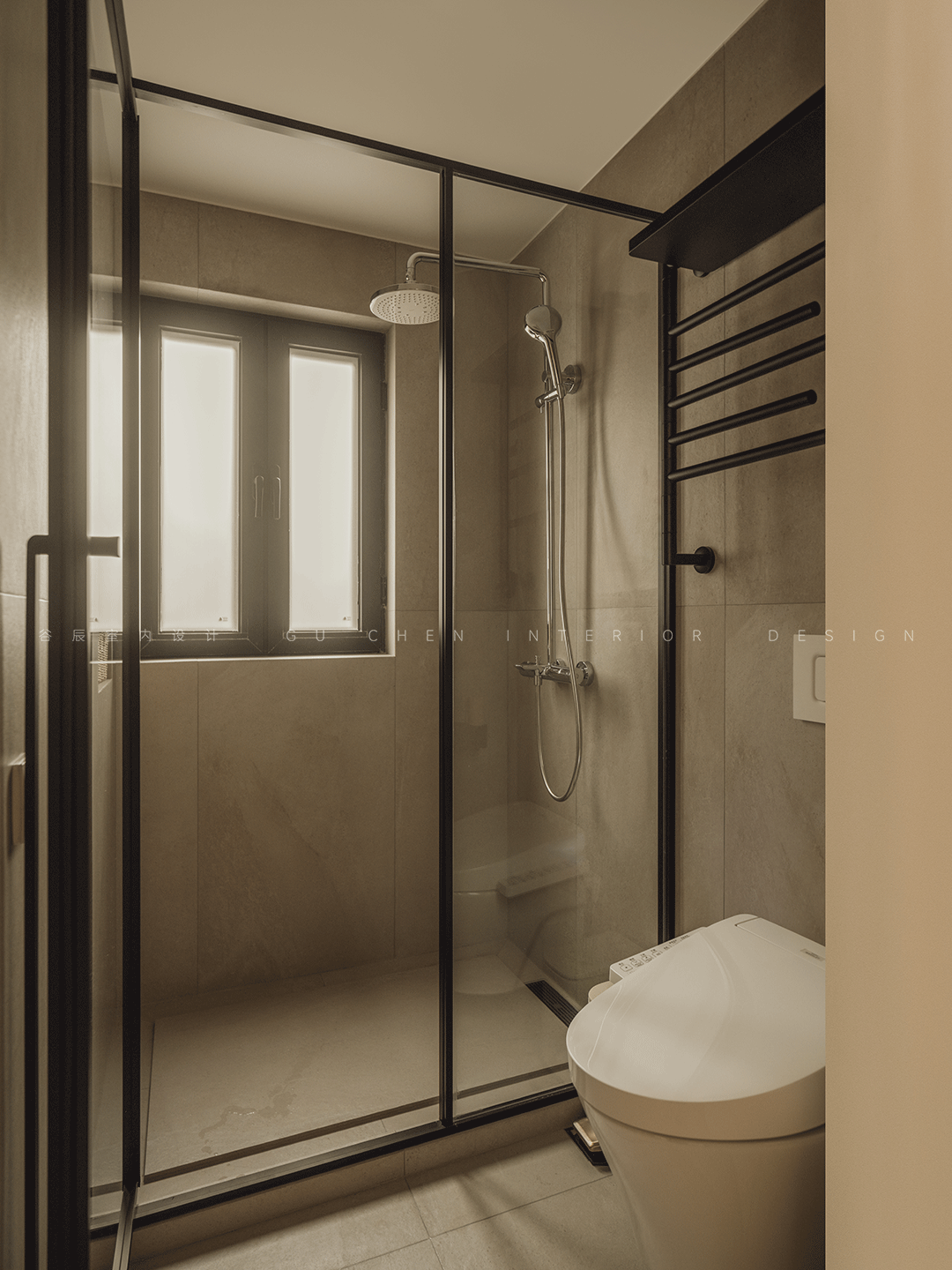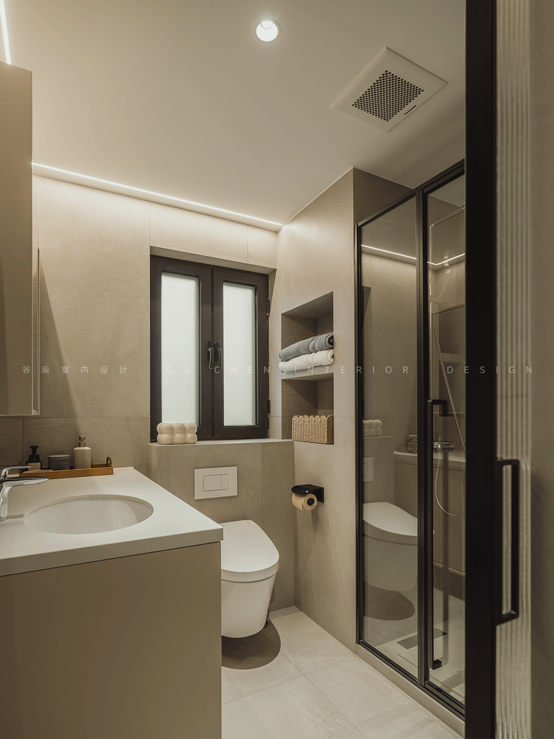 主卧卫生间做了干湿分离,维持了卫生间的干净整洁,增强了使用上的舒适度。壁挂马桶,节省空间,让卫生无死角;壁龛设计让洗浴用品有了容身之地,必需品在触手可及的同时,也不干扰空间的整体美感。简洁的黑框玻璃淋浴隔断更是赋予了空间一种现代且高级的氛围。 08客卫 「轻态化的舒适,清爽感的体验」