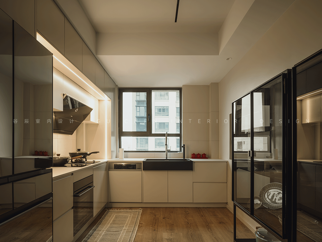 封闭式柜体+玻璃柜展示区+开放式置物架搭配,整个动线简单流畅,同时**程度地提升了空间的利用率。 04厨房 「幸福莫过于厨房有烟火,而家也有温度」